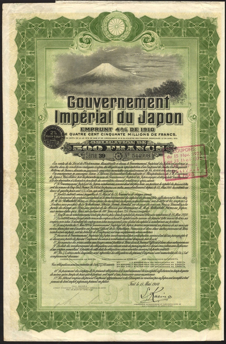 Imperial Japanese Government, 4% Loan, 1910, bond for 500 francs, no.544998, Mount Fuji at top, ornate border, green and black, printed by Waterlow & Sons, with coupons. VF.