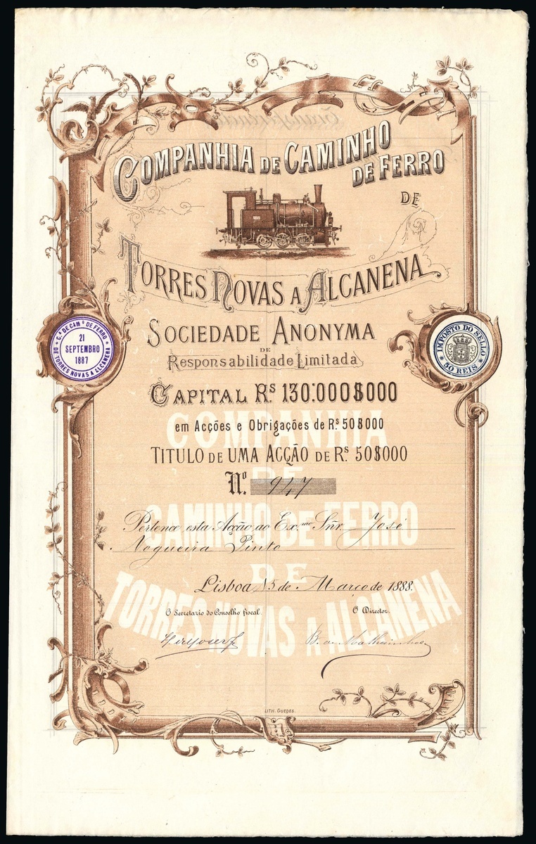 Companhia de Caminho de Ferro de Torres Novas a Alcanena, 50 Reis Share, Lisbon [1888], #947, decorative border with vines and scrollwork, steam engine at top, brown. A failed narrow gauge railway constructed largely on existing roads, running from Torres Novas to Alcanena in the Centro Region of Portugal. It was opened in 1893 and closed in the same year due to financial difficulties. About EF.