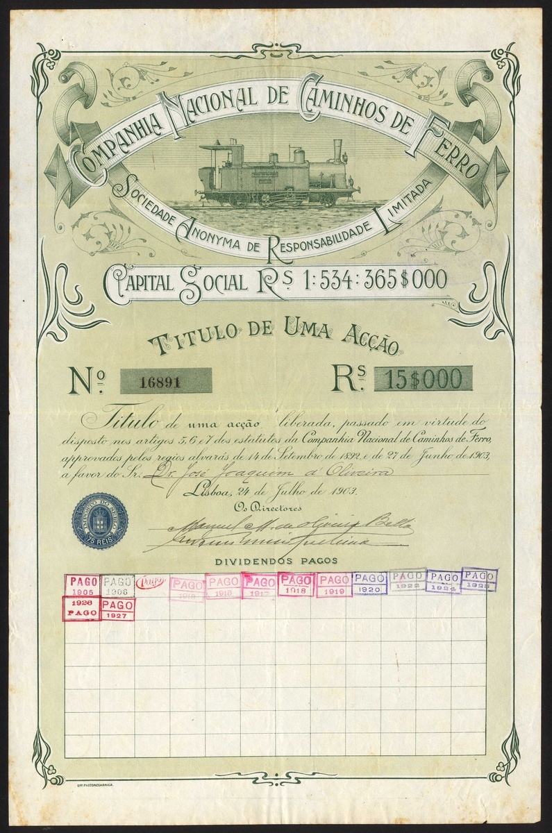 Companhia Nacional de Caminhos de Ferro S. A., one share of 15 reis, Lisbon 1903, #16891, vignette of tank locomotive, ornate border in Art Nouveau style, green. Light foxing to edges, VF.