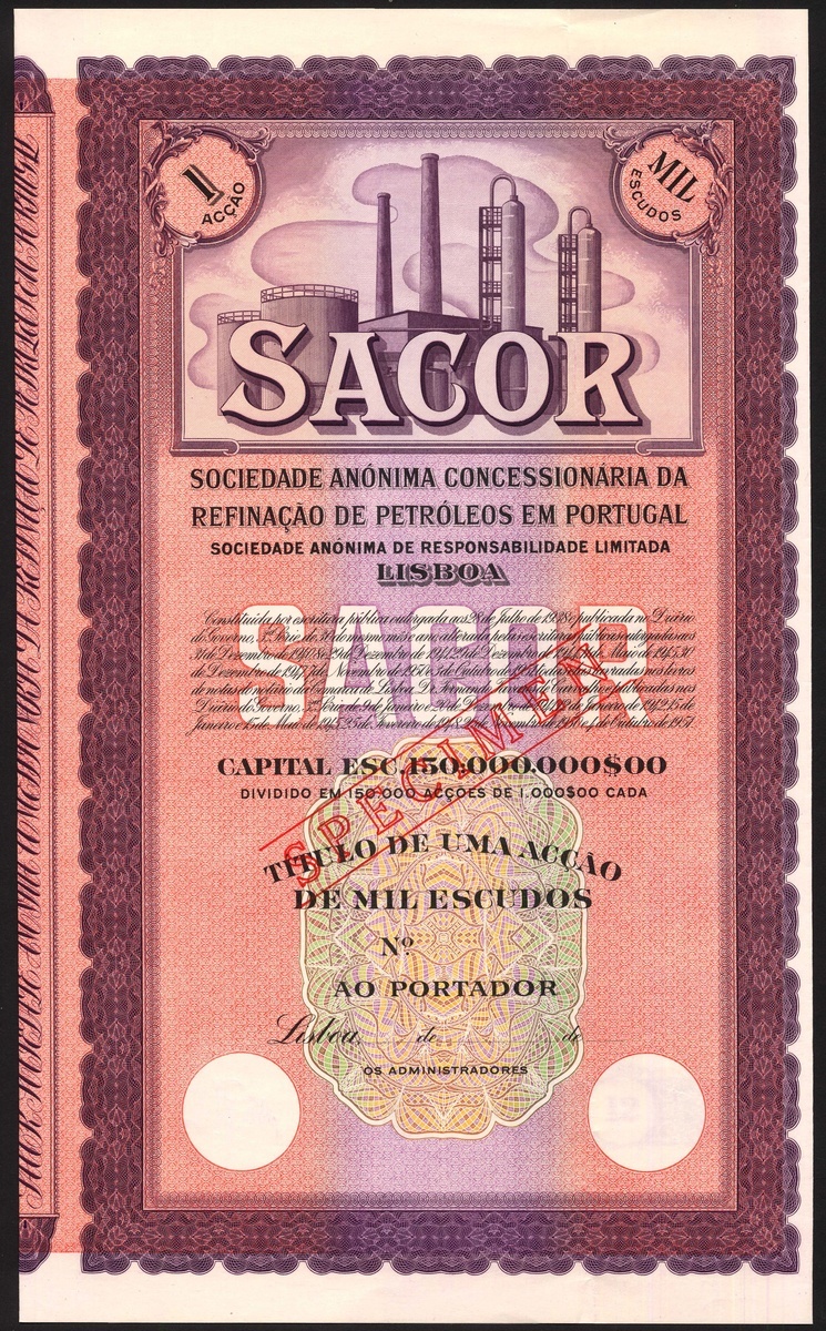 SACOR - Sociedad Anonima Concessionaria da Refinacao de Petroleos em Portugal, a group of specimen bearer shares from the Bradbury, Wilkinson & Co. archive, comprising, 1951, 1 share; 1953, 20 shares and 500 shares; 1958, 1 share, and, 1965, 1, 5 and 10 shares, all with stylised oil refinery at top, very colourful, with coupons or counterfoil. Generally EF and better (7).