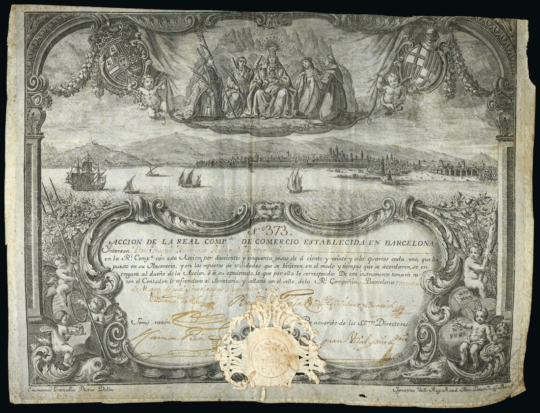 La Real Compania de Comercio Establecida en Barcelona, Accion 250 Pesos at 128 Quarters, Barcelona 30.5.1756, #373, printed on vellum. This Barcelona Trading company was founded in 1755. It was granted the monopoly on trade with Santo Domingo, Puerto Rico and Venezuela (Margarita Island) and trade concession allowing trade with Buenos Aires. Lack of capital led to the company's activities being taken over by the Filipinas Company in 1785. Some creases and a small missing piece right border, slight discolouration. Part of seal missing. AVF..