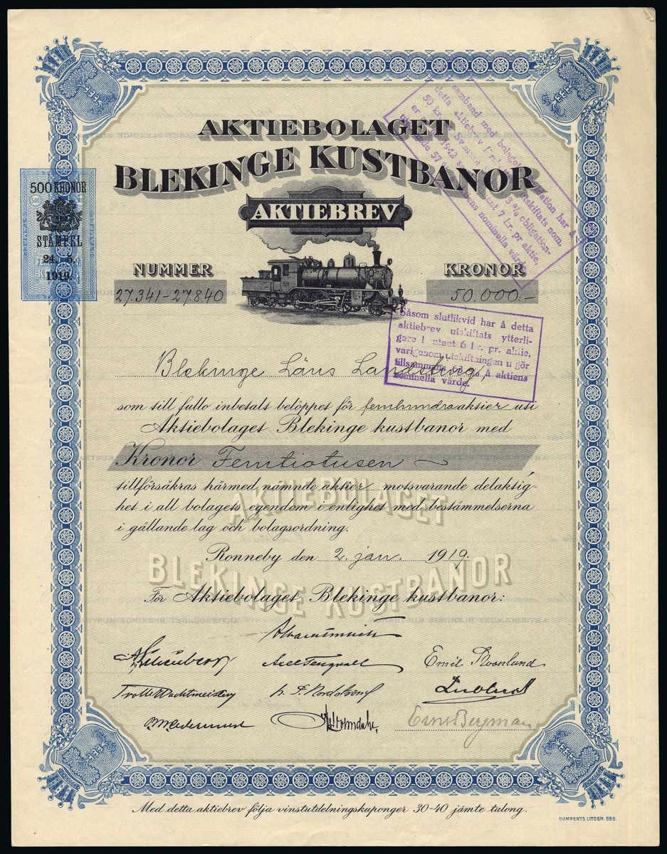 AB Blekinge Kustbanor (Blekinge Coastal Railway), [500] shares of 100 kroner, Ronneby 19[19], #27341-27840, steam train at top, blue and black, 4 pages, rare 500 kroner blue duty stamp. A narrow gauge railway of 1067mm gradually joining with others to form a route between Kristianstad and Karlskrona. Broadened after being sold in 1942 and still running today. Near EF and rare denomination not yet catalogued.