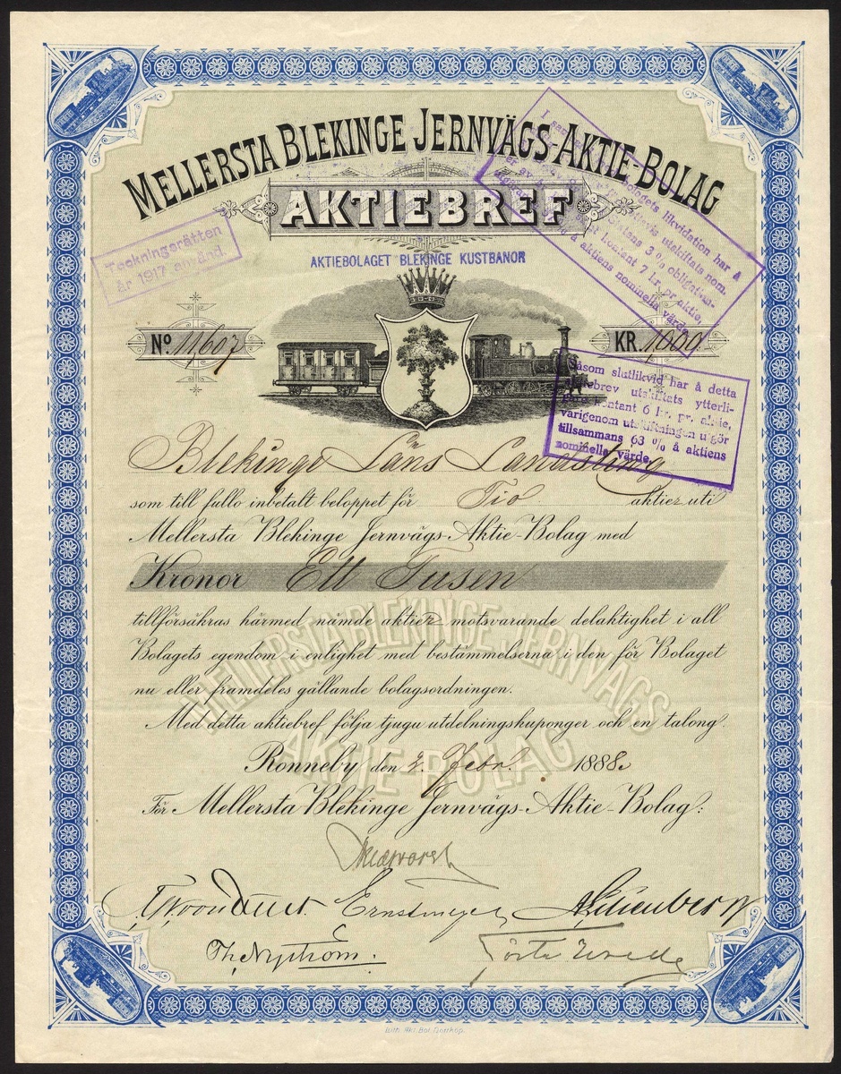 Mellersta Blekinge Jernvägs AB, Central Blekunge Railway) 1000 kroner, Ronneby 188[8], #11607, steam train and coat of arms in centre, blue and black, 4 pages. Narrow gauge (1067mm) coastal railway built 1884-86 joining the group of lines between Karlskrona and Kristianstad. Taken over by Swedish Railways in 1942. GVF and scarce early date.
