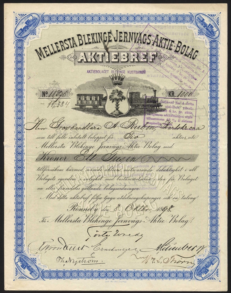 Mellersta Blekinge Jernvägs AB, Central Blekunge Railway) 1000 kroner, Ronneby 188[98], #11375-384, steam train and coat of arms in centre, blue and black, 4 pages. Narrow gauge (1067mm) coastal railway built 1884-86 joining the group of lines between Karlskrona and Kristianstad. Taken over by Swedish Railways in 1942. GVF and scarce early date.