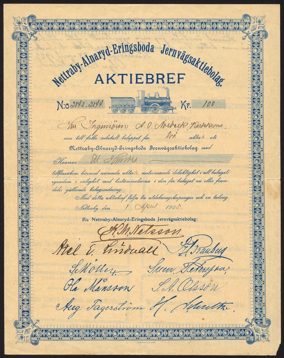 Nettraby-Alnaryd-Eringsboda Jernvagsaktiebolag, certificate for [2] shares of 50 kroner, Nattraby 190[5], #2843-2844, steam engine and tender in profile at top, blue, with coupons. A 45km narrow gauge line (600mm 1ft 115/8 in) now defunct. Slight chipping at right edge, centre fold, AVF and scarce.
