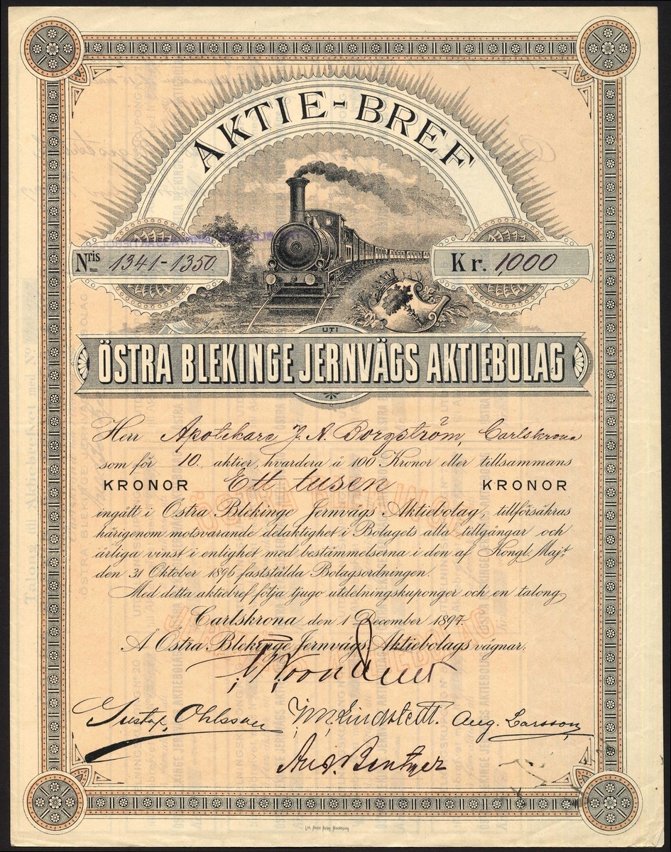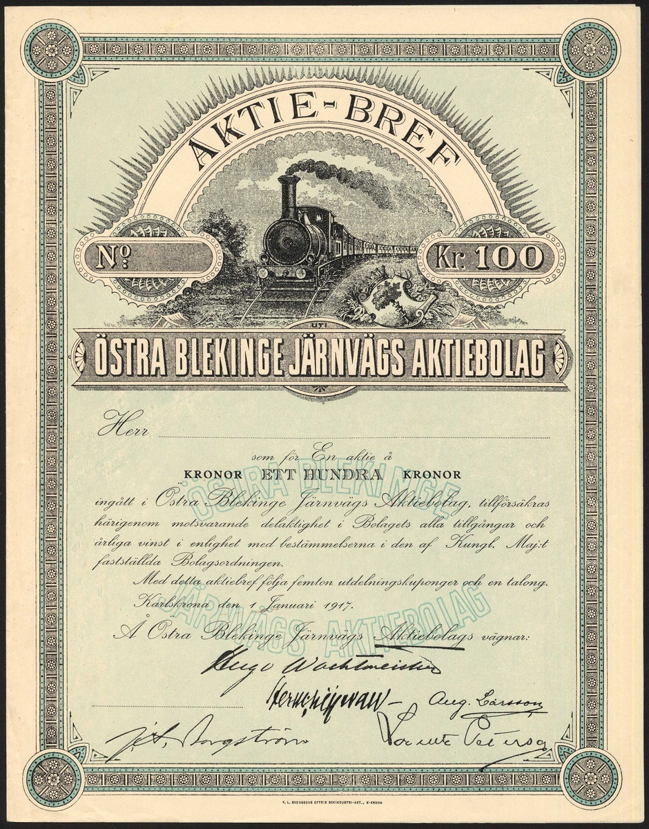 Östra Blekinge Jervägs AB, 10 shares of 100 kroner, Carlskrona 1897, #1341-1350, together with an unissued certificate for 1 share of 100 kroner, 1917, same design of steam train at top, black with yellow underprint and blue underprint respectively, 4 pages. A narrow gauge railway (1067mm) opened in 1899. Taken over by Swedish Railways after 1942. GVF and EF (2)