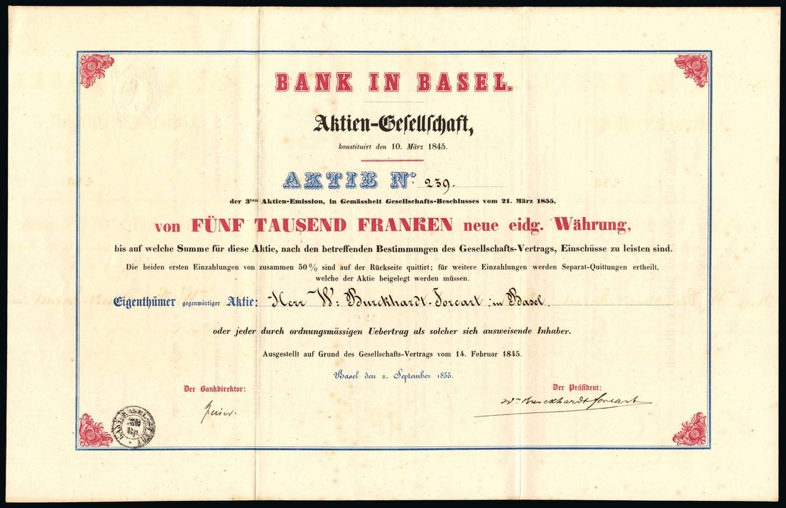 Bank in Basel, Share Fr. 5000, Basel 2.9.1855, #239, red/blue, original signature of J.J. Speiser as "Bankdirektor", issued to and signed by Wilhelm Burckhardt-Forcart (1797-1880) as "President". In 1845, Johann Jakob Speiser founded the 'Bank in Basel' as private note-issuing bank at the Marktplatz in Basel with a capital of Fr. 500'000 divided in 100 shares. It was one of the two banks in the City of Basel that owned the right for issuing banknotes. After the founding of the Swiss National bank the Bank lost its main business activity and, in 1907, was taken over by the Bankverein. Johann Jakob Speiser (1813-1856) was the main coin expert to the Swiss Federal Government and had a crucial role in the introduction of the Swiss Franc in 1850. Speiser was also a founder of the Schweizerische Centralbahn. This very rare share is one of the most important witnesses to the history of the introduction of the Swiss Franc. VF[*R10].