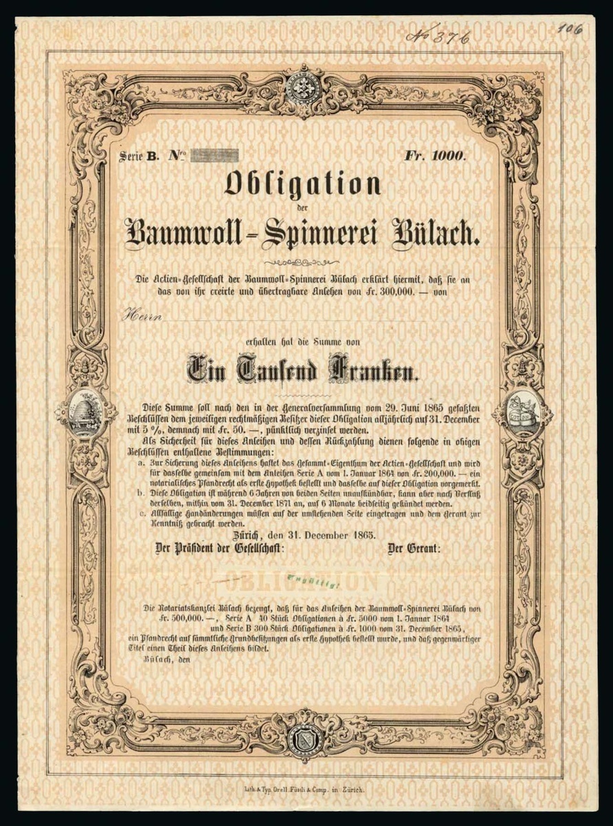 Baumwoll-Spinnerei Bülach, Obligation 1,000 Franken, Zürich 31. Dezember 1865, unissued. In 1889, the company was taken over by Spinnerei Ziegler & Brunner. EF.