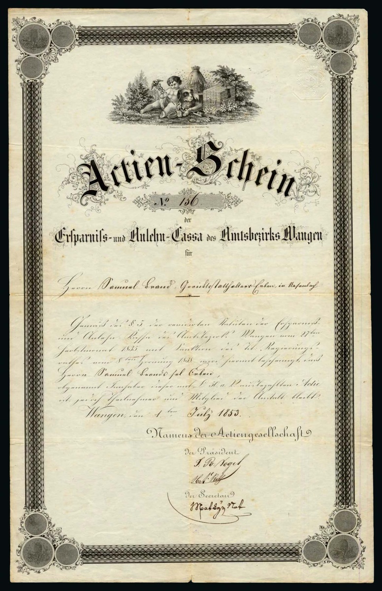 Ersparnis- und Anlehn-Cassa des Amtsbezirks Wangen, Aktien-Schein 50 Gulden, Wangen 1. Juli 1853, #156. This bank was founded in 1824 and taken over by SBG/UBS in 1994. One of the earliest Swiss bank shares. VF