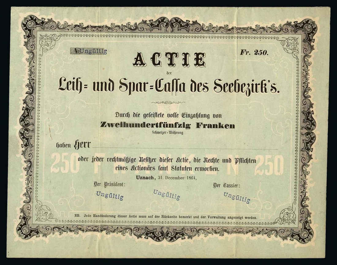 Leih- und Spar-Cassa des Seebezirk's, Aktie über 250 Franken, Uznach 31. Dezember 1864, unissued. Predecessor of today's Bank Linth LLB, EF