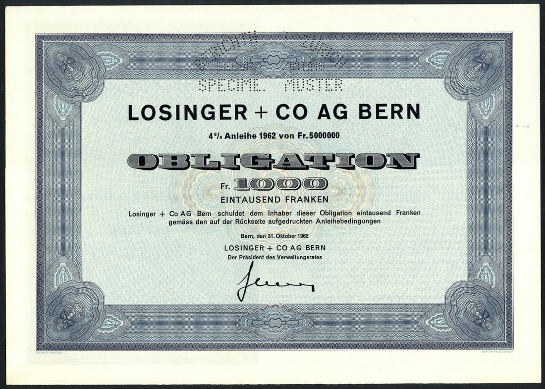 Losinger + Co AG, 4½% Obligation Fr. 1000, Bern 1962, specimen/muster. The Company was founded in 1922 by the brothers Oskar and Eugen Losinger. One of the biggest Swiss construction companies. Today part of the French Bouygues. UNC.