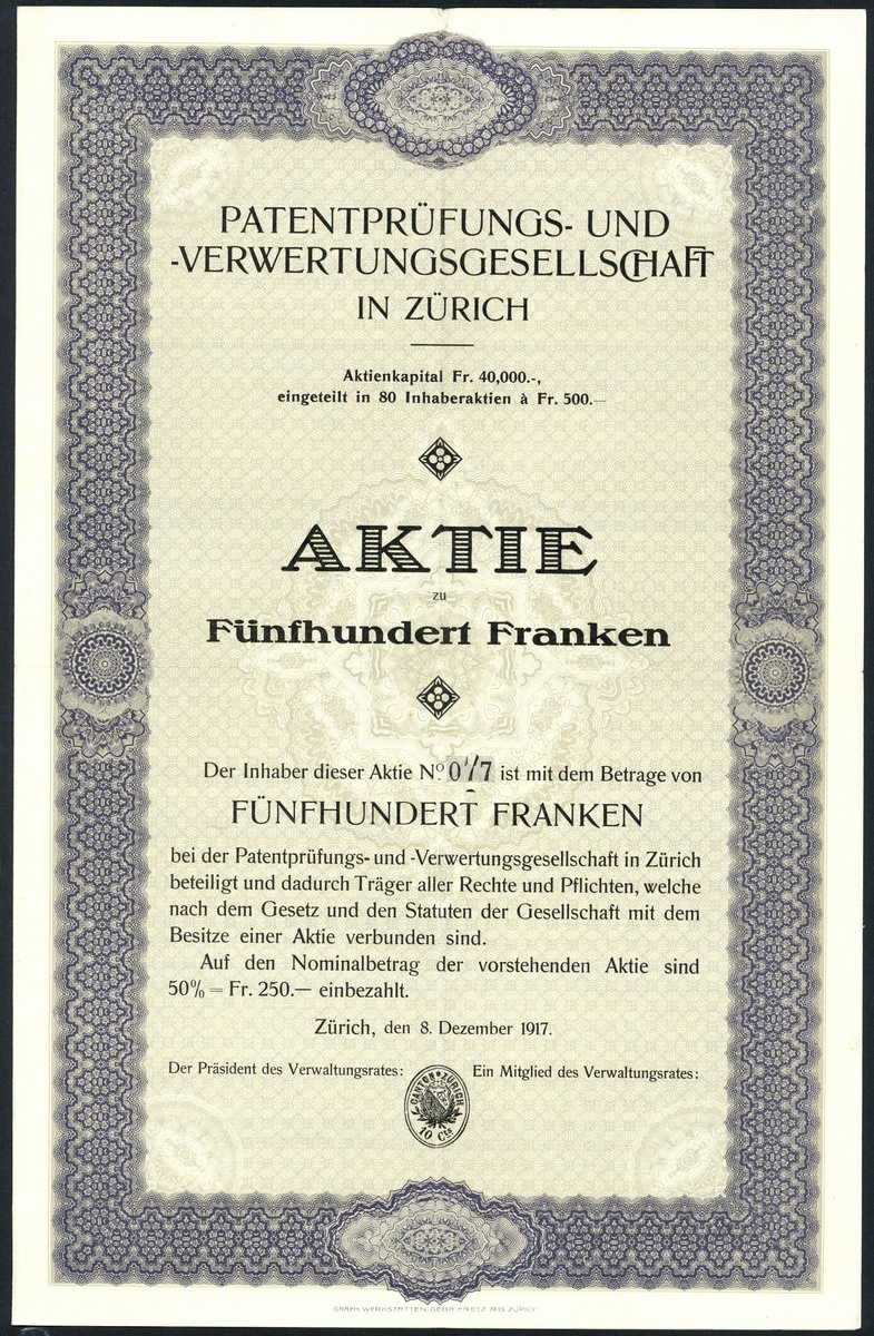 Patentprüfungs- und -Verwertungsgesellschaft in Zürich, Aktie Fr. 500, Zürich 8. Dezember 1917, #077, semi-issued. EF.