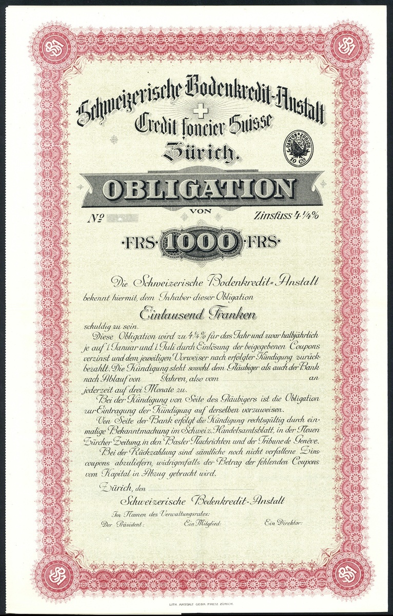 Schweizerische Bodenkredit-Anstalt, 4¼% Obligation Fr. 1000, Zürich circa 1910, unissued. The Bank was founded in 1897. In 1903, the Schweizerische Kreditanstalt acquired 28% of its share capital. In 1976 full integration. Item never seen before. EF.