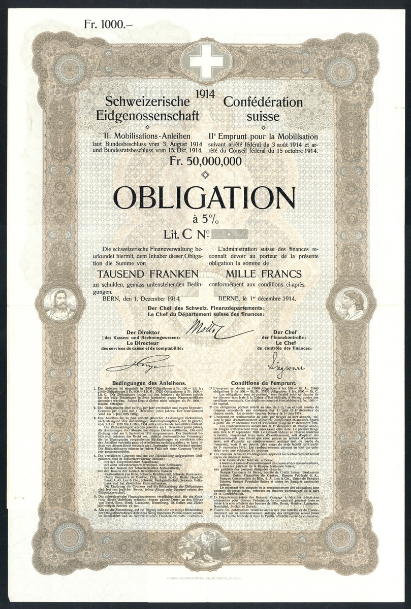 Schweizerische Eidgenossenschaft, Zweite 5% Mobilisations-Anleihe Fr. 1000, Bern 1914, unissued, vignettes with Tell, Helvetia and Mountain Jungfrau, print signature of Bundesrat Giuseppe Motta (1871-1940). This second mobilisation loan was fully repaid in 1934. EF.