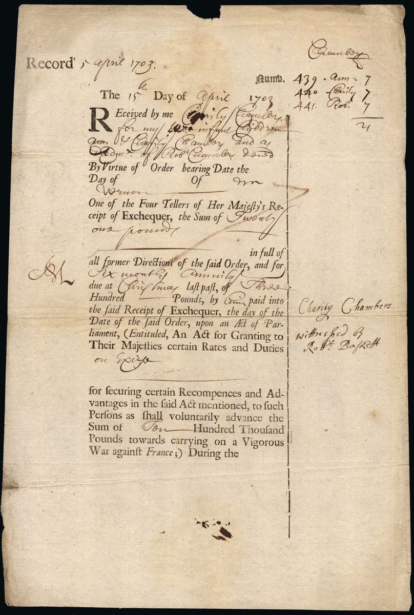 Exchequer receipt, 1[703], for the sum of £21, being 6 months annuity on a £300 loan to the Exchequer issued under an 'Act for granting to Their Majesties certain Rates and Duties [on excise] ..... carrying on a Vigorous War against France', signed by the holder Charity Chambers and a witness, single page, folio, printed with manuscript insertions. Part of a £1,000,000 loan raised to finance the War of Spanish Succession. Small chip at top edge but AVF