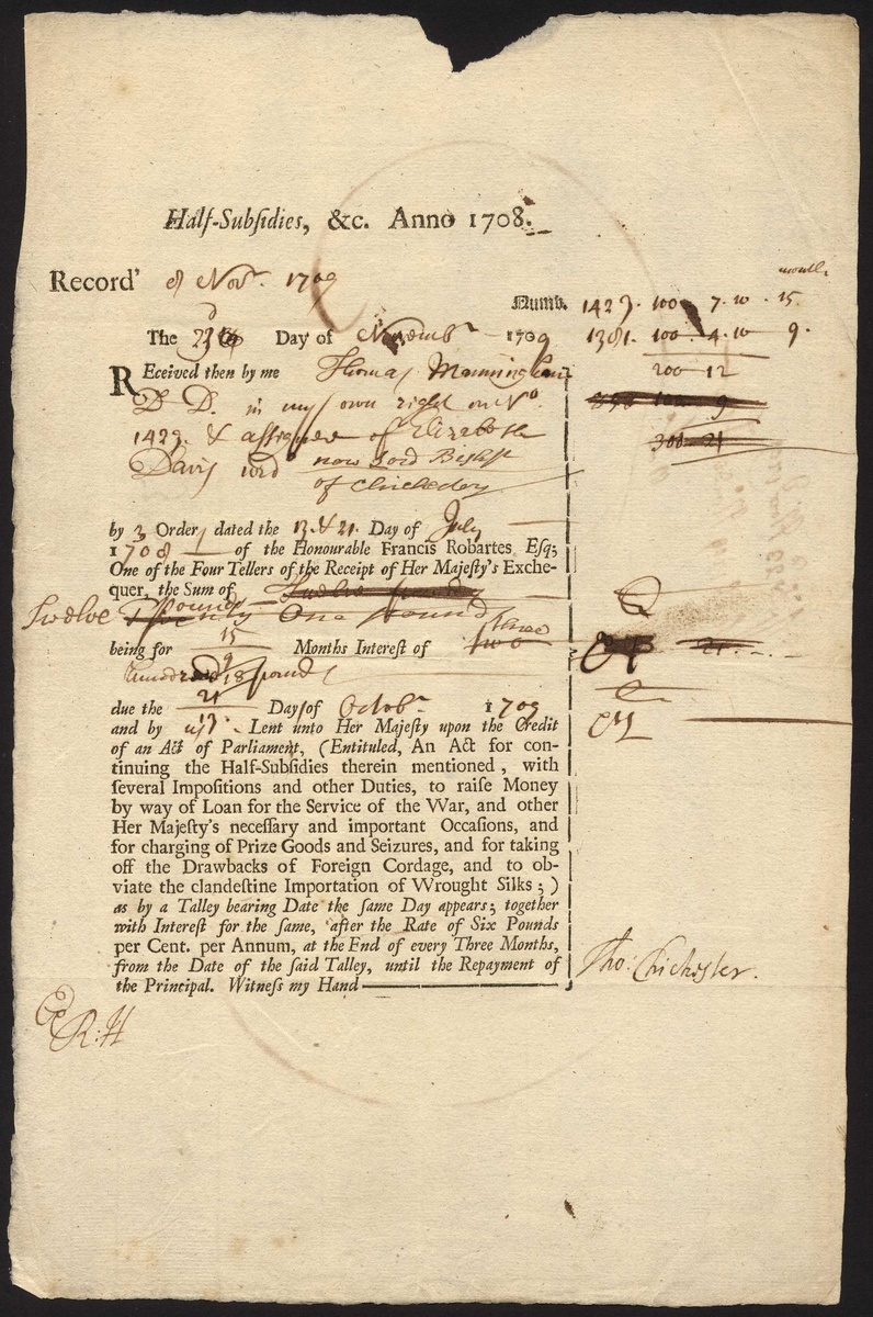Exchequer receipt, 170[9], for the sum of £12, being 15 months annuity on a £300 loan to the Exchequer issued under an 'Act for Continuing the Half Subsidies .... Loan for the Service of the War', signed by Thomas Chichester, single page, folio, printed with manuscript insertions. Further loan to finance the War of Spanish Succession. Piece missing at top edge but AVF