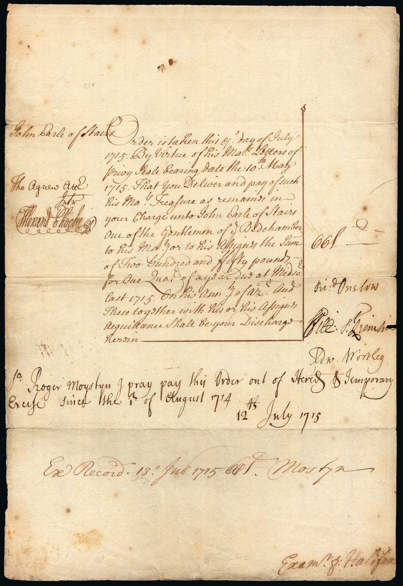 Exchequer Order of Payment, July 1715. Manuscript order to pay £250 to John Earl of Stair(s) sic, 'one of the gentlemen of the bedchamber to his majesty' for one quarter of a year', signed by Richard Onslow, 1st Baron Onslow, Sir Roger Mostyn, 3rd Baronet, as two of the tellers of the Exchequer, and George Montagu, 1st Earl of Halifax as auditor of the Exchequer. In particularly complete state with just splits at folds on full folio sheet.