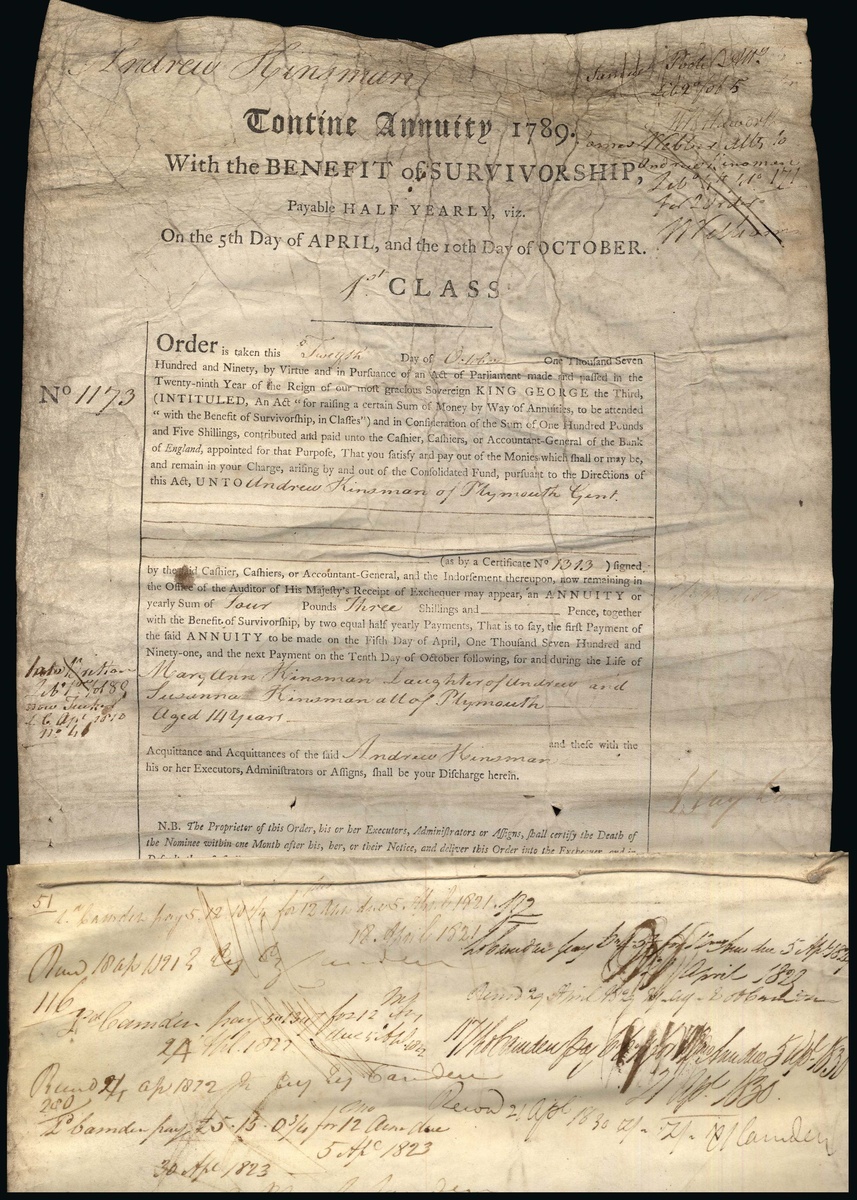 Tontine Annuity 1789, a vellum certificate for £100 and 5 shillings, 1790, in the name of the daughter of Andrew Kinsman, paying an annual annuity of £4 3/- with the benefit of survivorship, black printing, on vellum, with receipts to 1828, some on attached vellum sheets sewn at the base. Creased, fine and very rare. [R11]