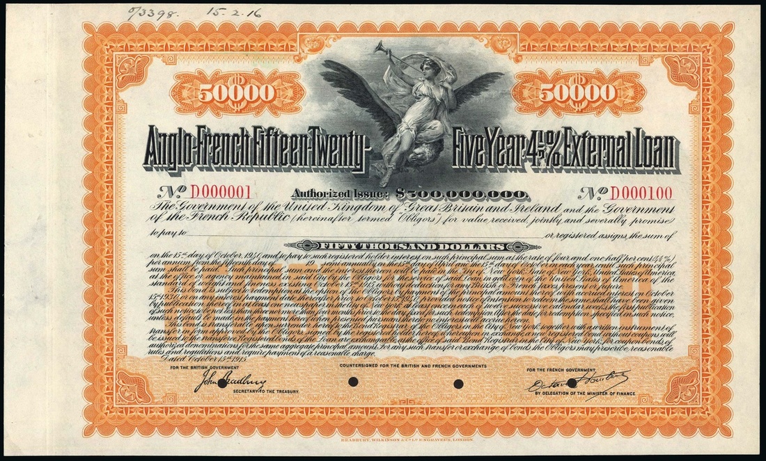 Anglo-French 15-25 Year 4½% External Loan, 1915, a specimen registered bond for $50,000 from the Bradbury, Wilkinson & Co. archive, facsimile signature of John Bradbury as secretary to the Treasury, allegorical female blowing horn riding on the back of an eagle, ornate border, orange and black, small punch hole cancellations. about EF and extremely rare [R12*].