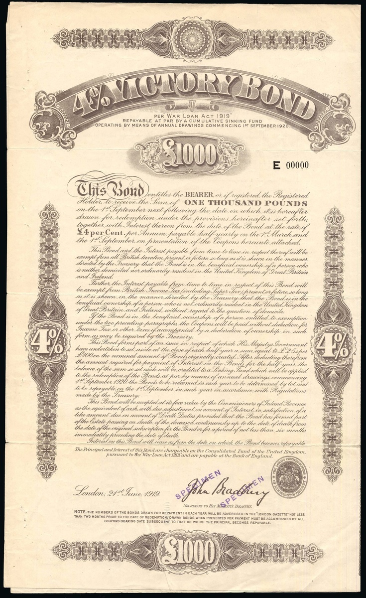 1919 (June 21st), 4% Victory Bond, |£1000, a specimen certificate numbered E00000 and overprinted specimen in several places, facsimile signature of John Bradbury as secretary of the Treasury, ornate scrollwork, grey-brown, with coupons. AVF and extremely rare [R12]