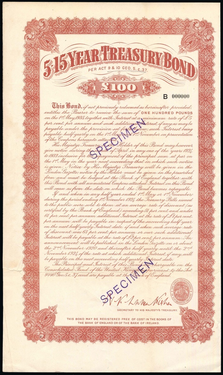 1920, 5-15 Year Treasury Bond, £100, a specimen certificate numbered B000000 and overprinted specimen in several places, facsimile signature of N K Warren-Fisher as Secretary of the Treasury, orange-brown, with coupons. GVF and extremely rare [R12].