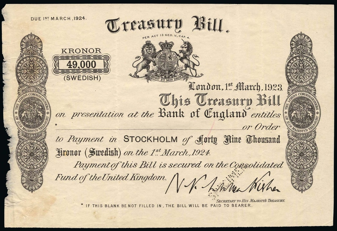 H.M.Treasury, a specimen Short Term Treasury Bill, London 1st March 1923 in the sum of 49,000 Swedish kronor, payable in Stockholm, 1st March 1924, facsimile signature of N.K.Warren-Fisher as Secretary to the Treasury, coat of arms at top, black, perforated specimen over signature. Has been mounted on the reverse at left edge, poorly removed with some minor damage, very fine and extremely rare [R12]. Originally sold in these rooms in 2009 for £260.