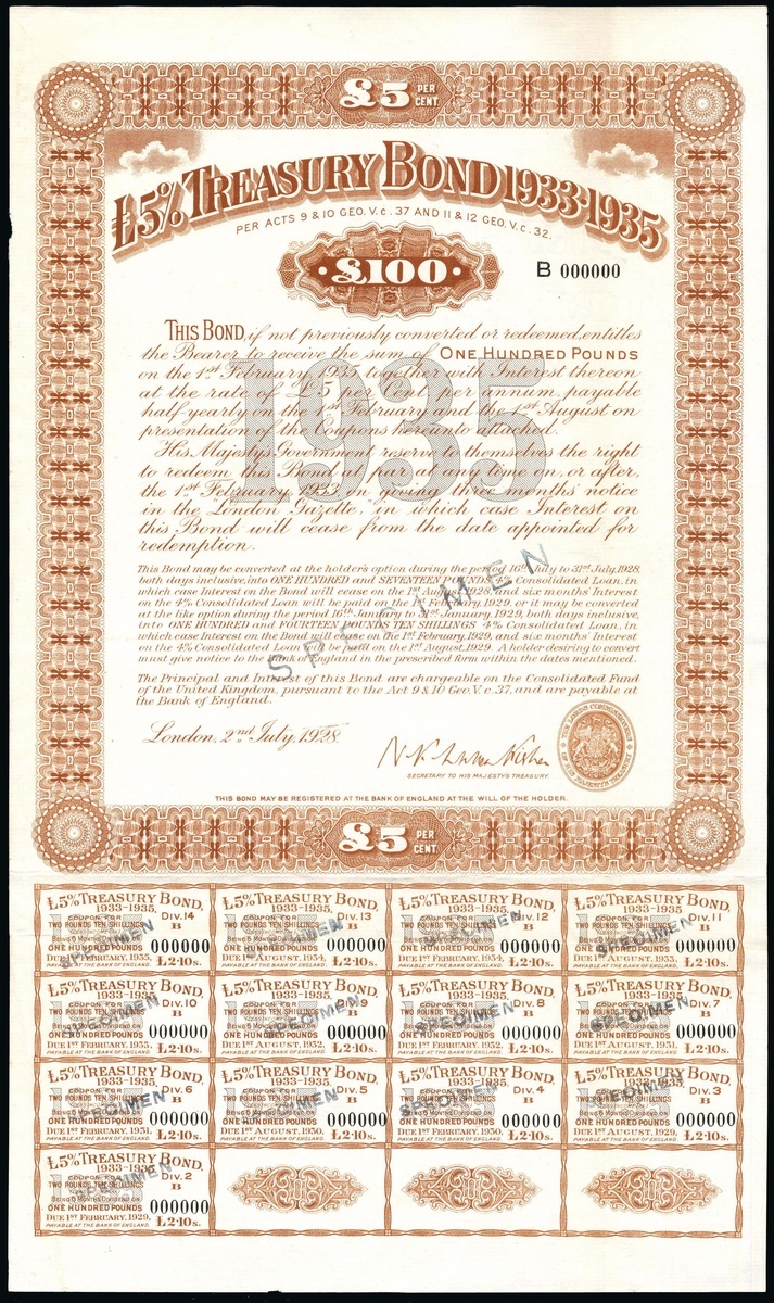 1928 (July 2nd), 5% Treasury Bond 1933-1935, £100, a specimen certificate numbered B000000 and overprinted specimen, facsimile signature of N K Warren-Fisher as Secretary of the Treasury, brown, '1935' in blue underprint, with coupons. GVF and extremely rare [R12].