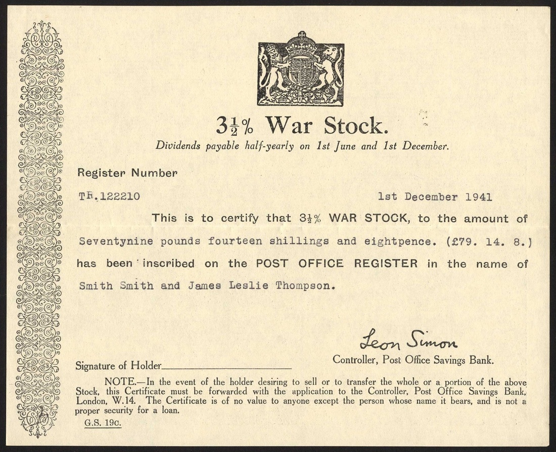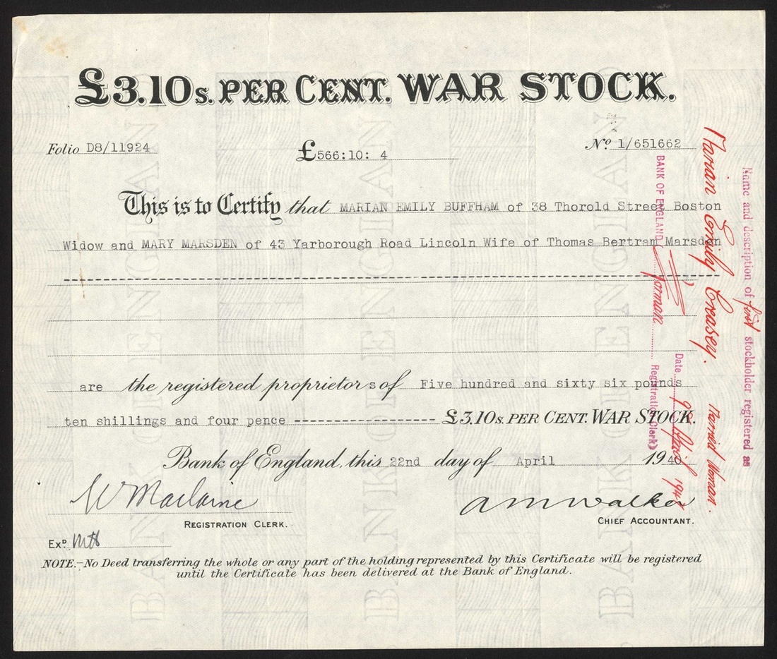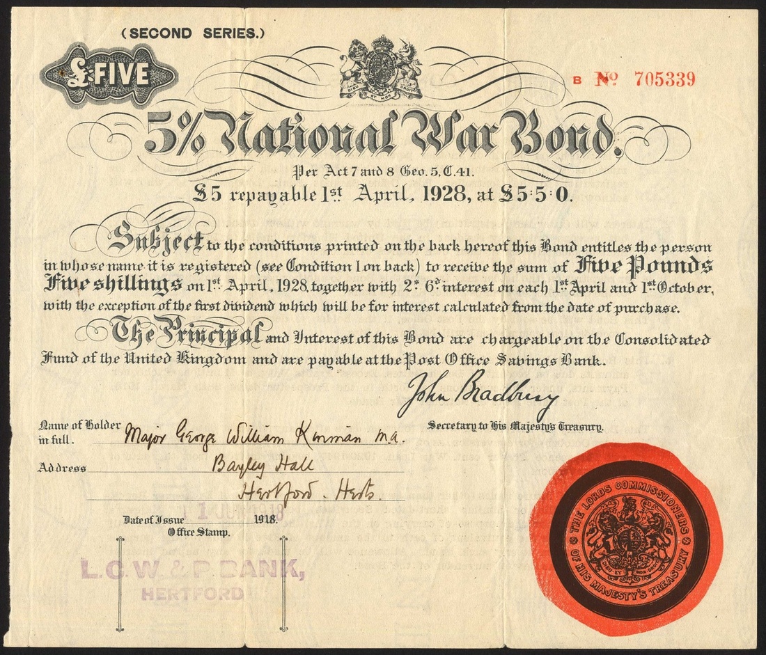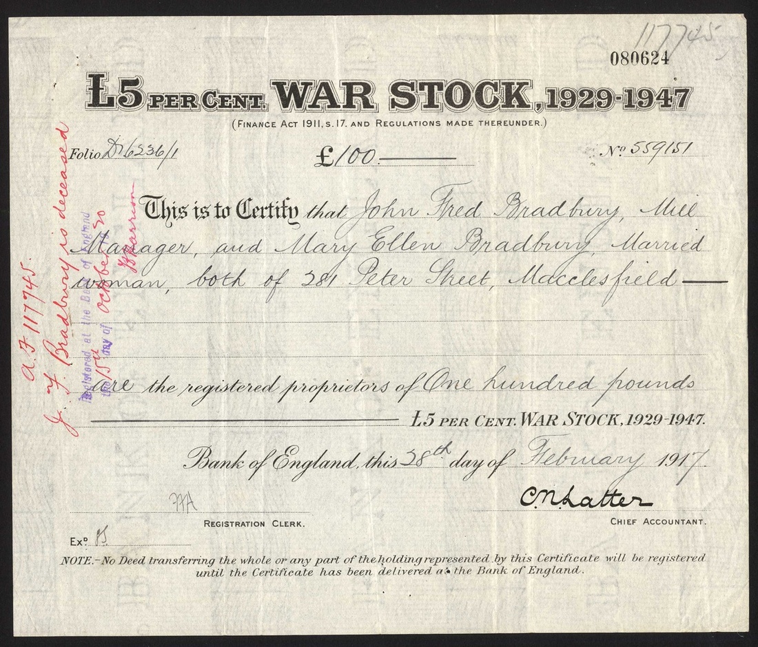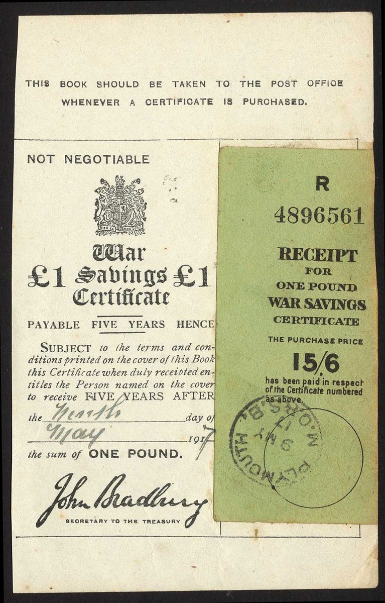 A series of certificates relating to various War Loans issued during the Anglo-Boer War, WWI and WWII, including 5% National War Bond for £5, 2nd series, facsimile signature of John Bradbury; £1 War Savings Certificate, 191[7], facsimile signature of John Bradbury; 31/2% War Stock, issued at the Post Office in 1941; a prospectus for the War Loan, 1925-1928; a series of 11 inscribed stock certificates for various War Loans, all different, et infra (2). An interesting group, generally VF (17)