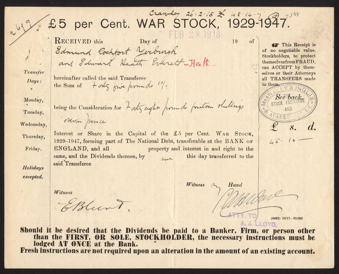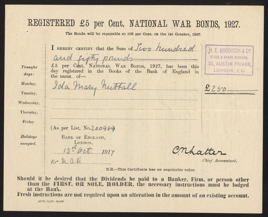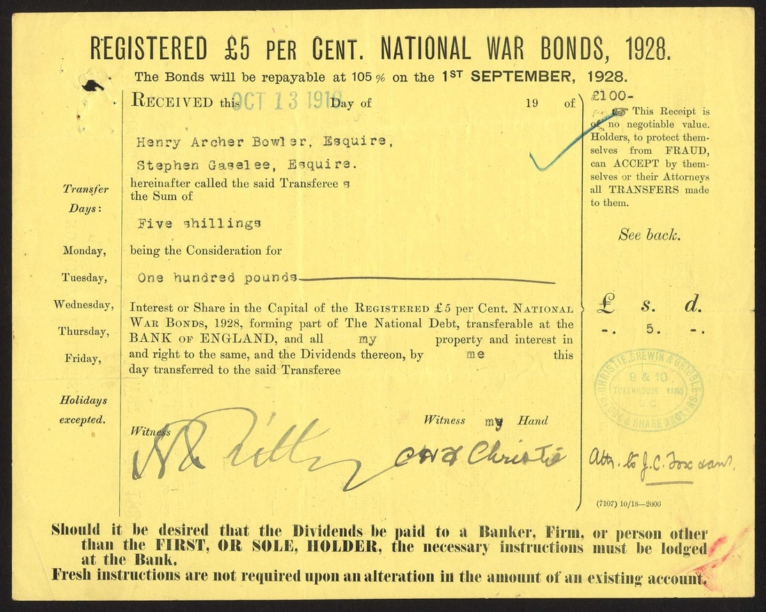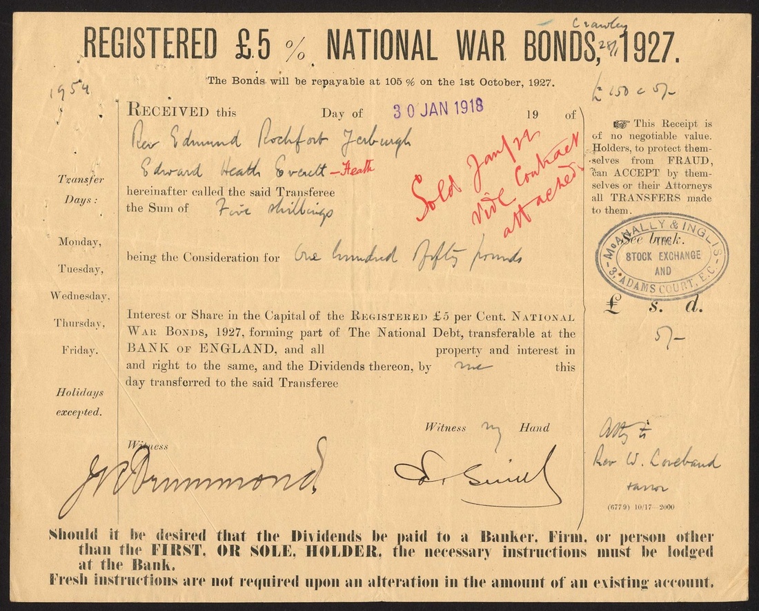 A series of certificates relating to various War Loans issued during the Anglo-Boer War, WWI and WWII, including 5% National War Bond for £5, 2nd series, facsimile signature of John Bradbury; £1 War Savings Certificate, 191[7], facsimile signature of John Bradbury; 31/2% War Stock, issued at the Post Office in 1941; a prospectus for the War Loan, 1925-1928; a series of 11 inscribed stock certificates for various War Loans, all different, et infra (2). An interesting group, generally VF (17)