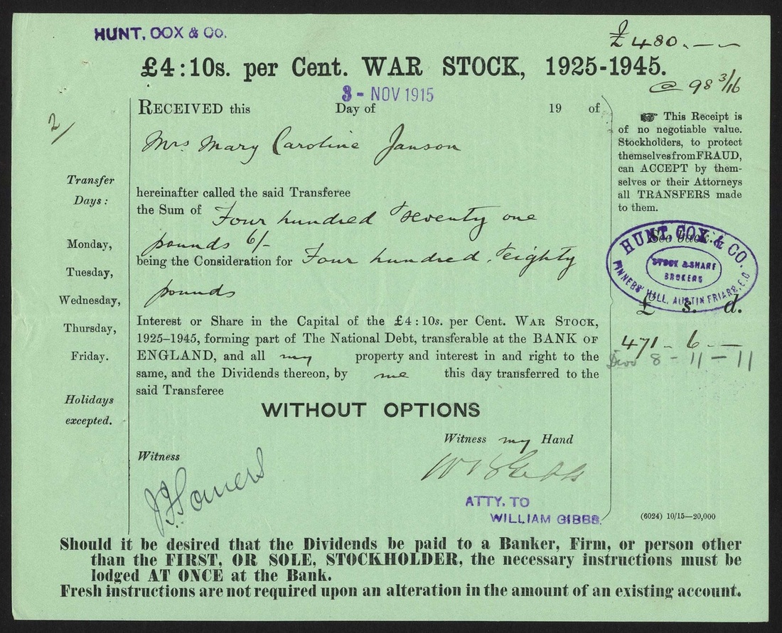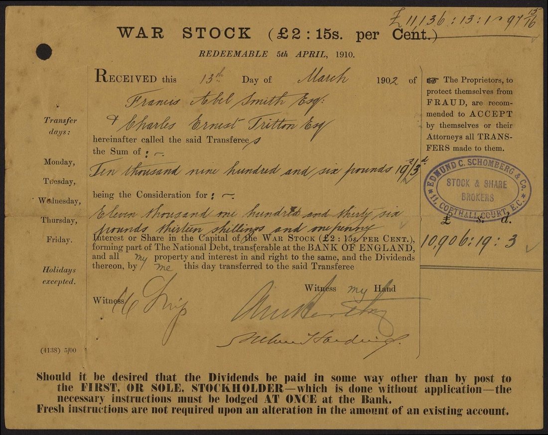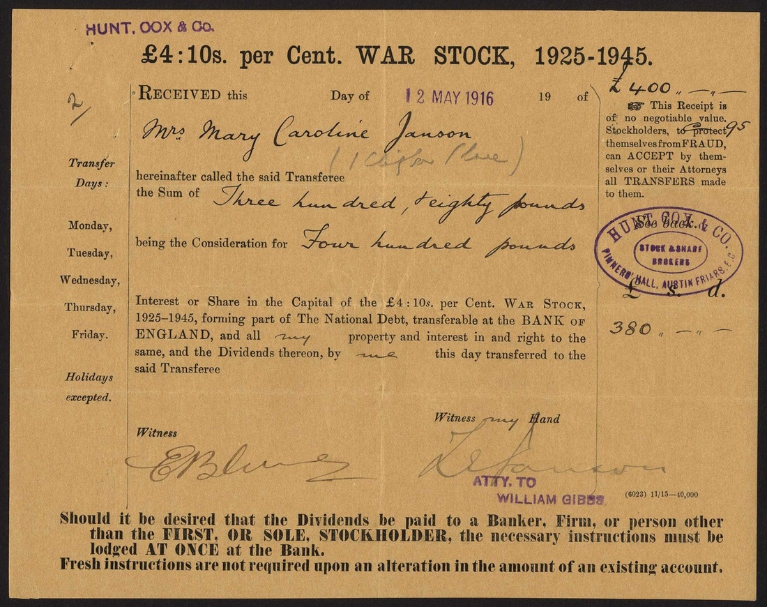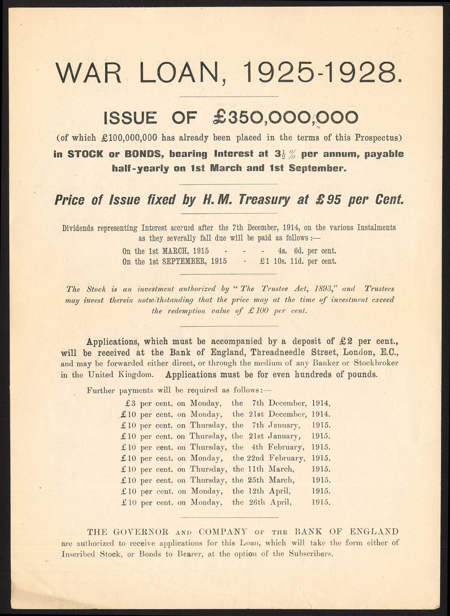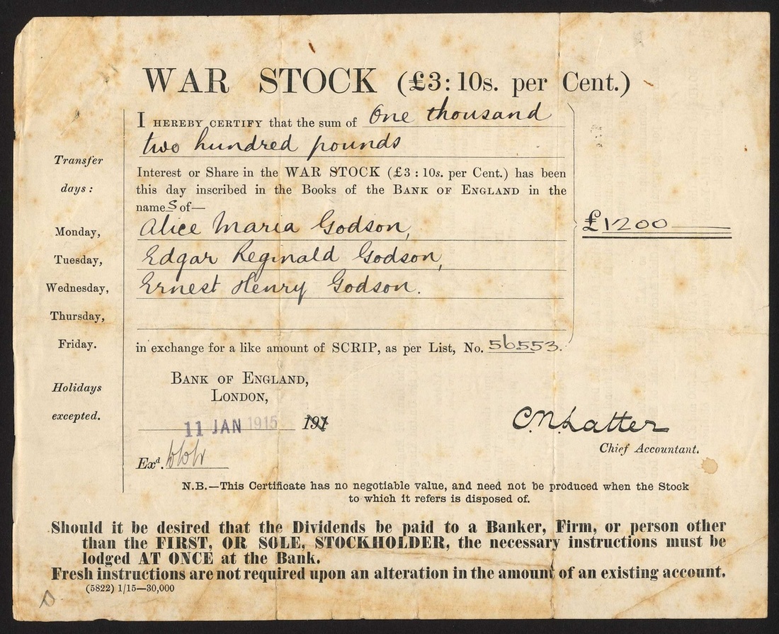 A series of certificates relating to various War Loans issued during the Anglo-Boer War, WWI and WWII, including 5% National War Bond for £5, 2nd series, facsimile signature of John Bradbury; £1 War Savings Certificate, 191[7], facsimile signature of John Bradbury; 31/2% War Stock, issued at the Post Office in 1941; a prospectus for the War Loan, 1925-1928; a series of 11 inscribed stock certificates for various War Loans, all different, et infra (2). An interesting group, generally VF (17)