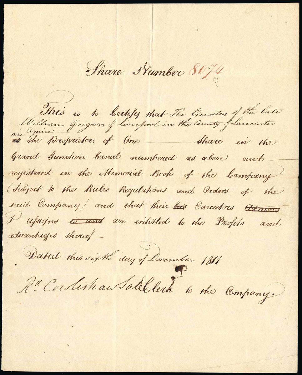 Grand Junction Canal, an interesting handwritten share certificate dated 1811, #8074, handsigned by the Sale Clerk to the company, in the name of the Executors of the late William Gregson of Liverpool. F-VF.