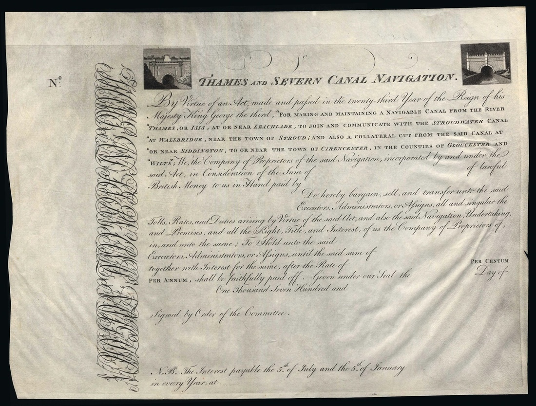 Thames and Severn Canal Navigation, an unissued general bond, 17- [1783], vignettes at top of bridges over the canal, black printing, on vellum. The canal from the River Thames at Leachlade to join the Stroudwater Canal near Stroud and also to Cirencester. An interesting piece on which the amount lent to the company and the interest rate were to be inserted by hand. We have seen issued pieces but they are usually cancelled by cutting away the bottom right of the document which bore the company seal. AEF.