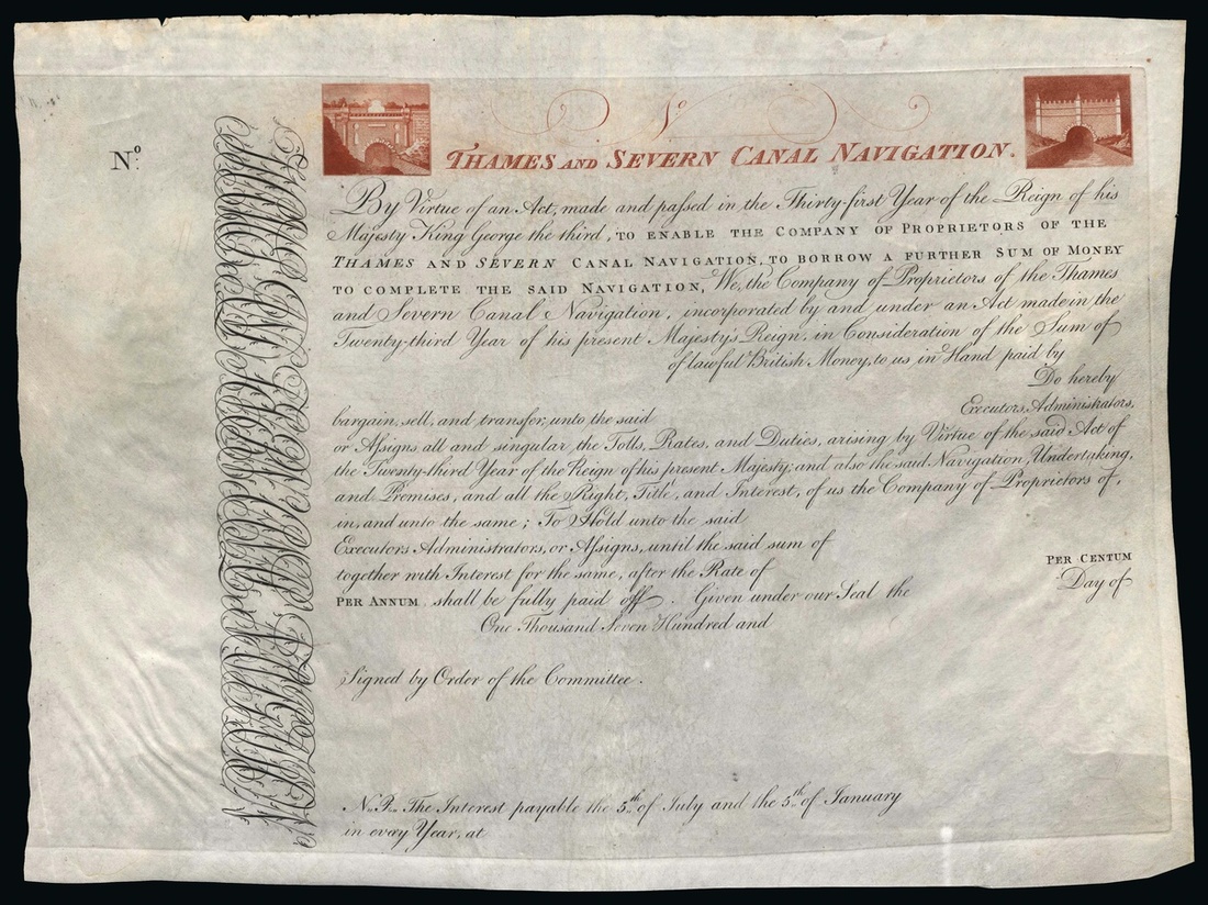 Thames and Severn Canal Navigation, an unissued general bond, 17- [1791], vignettes at top of bridges over the canal, orange-brown and black printing, on vellum. The loan was raised to complete the canal as per the Act of 1783. Decline of the canal coincided with the building of railways in the 1830's and it was in a poor state by the 1870's. Closed prior to WWII although there are several schemes of restoration in operation today. AEF