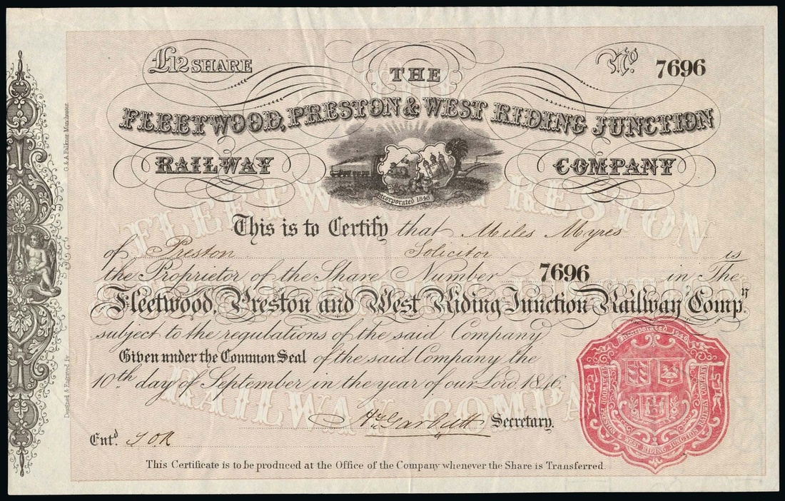 Fleetwood, Preston & West Riding Junction Railway Company, £12 share, 1846, #7696, coat of arms in centre, black, pink underprint, attractive red embossed seal. A little creased, VF.