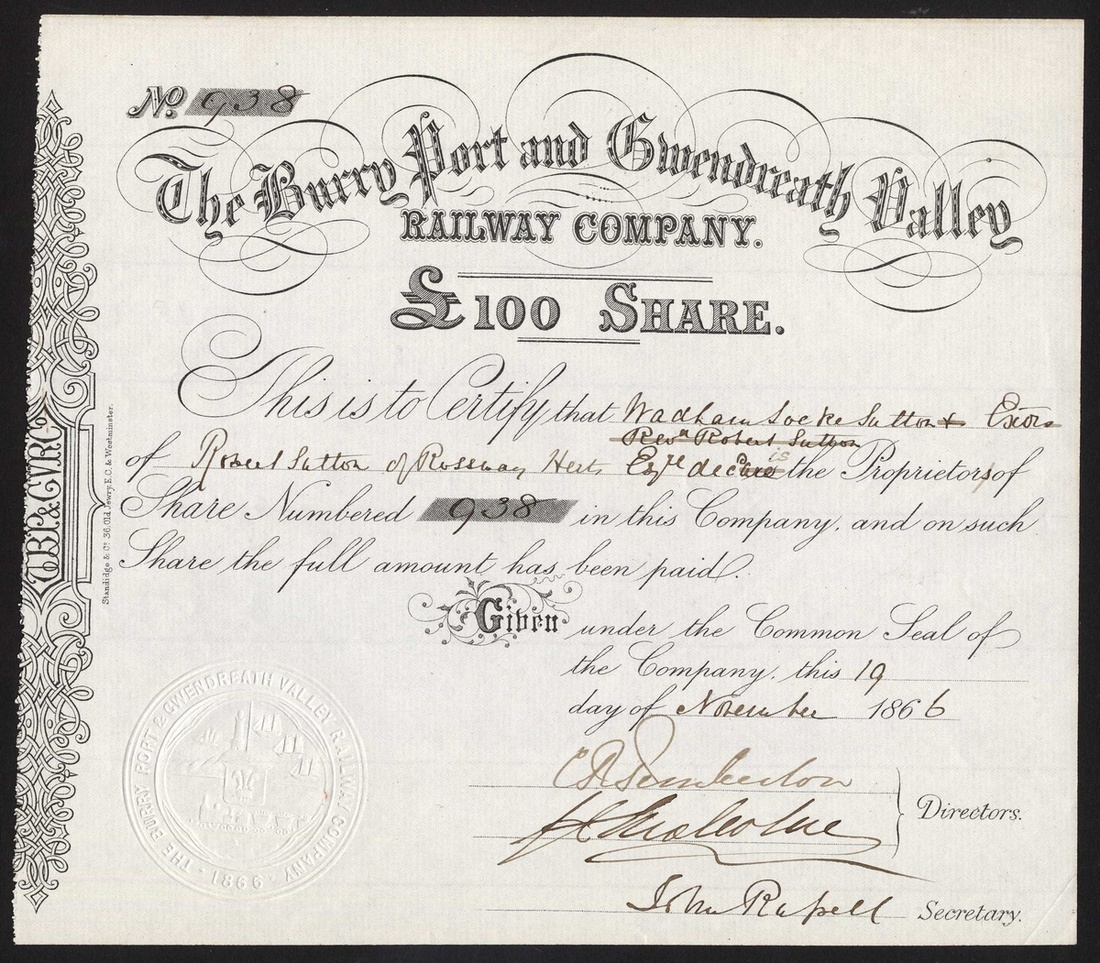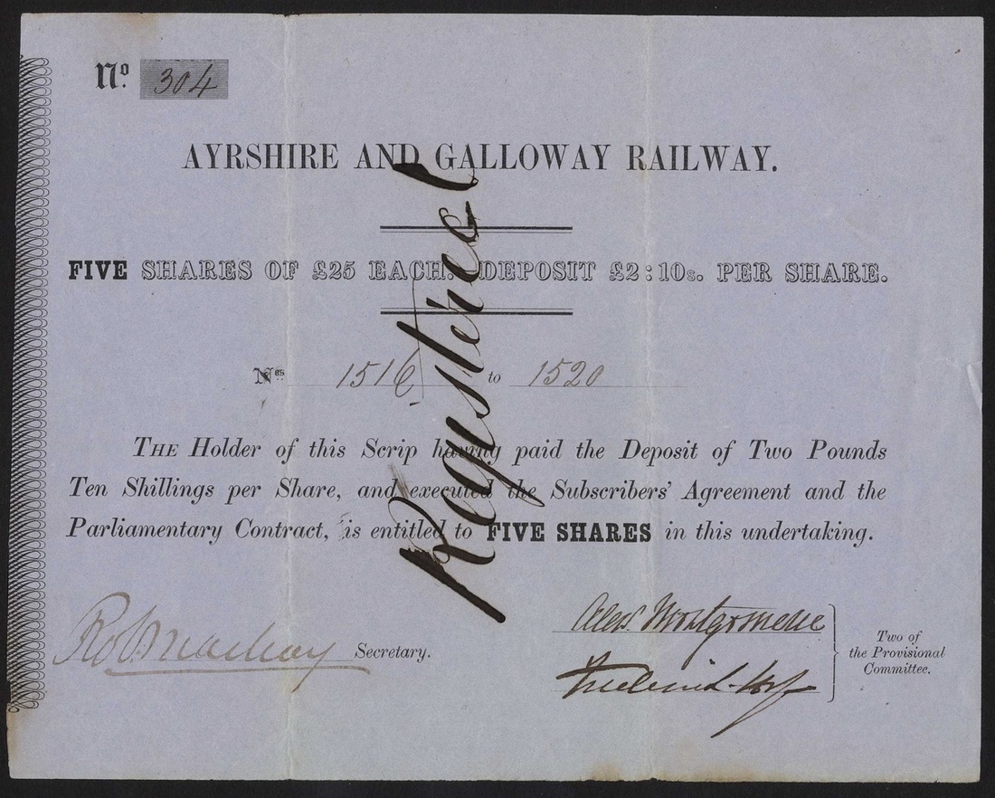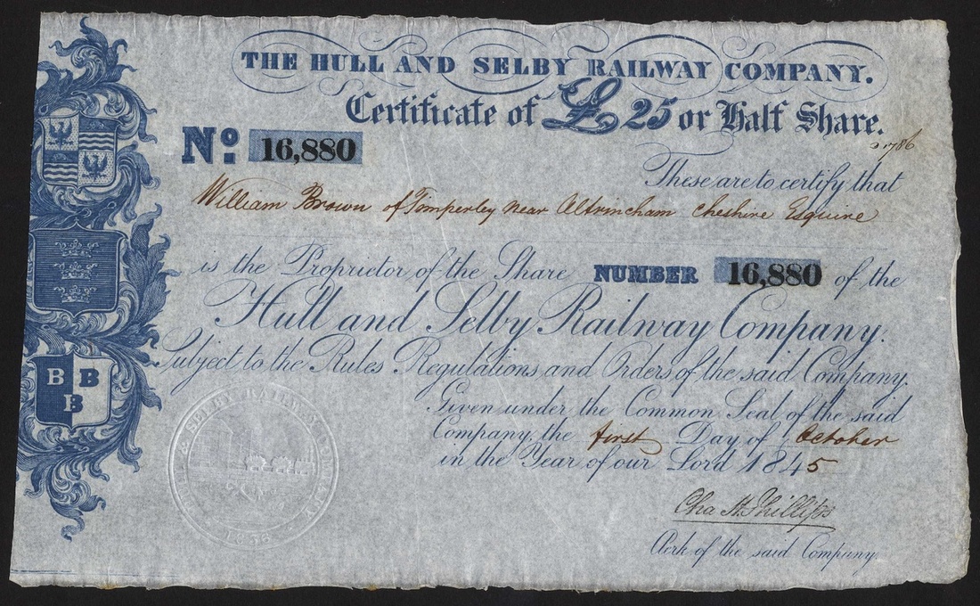 Hull and Selby Railway Co., £25 half share, 184[5], and £12.10s share, 18[45], together with Burry Port & Gwendreath Valley Railway Co., £100 share, 186[6]; Ayrshire & Galloway Railway, 5 shares, circa 1845; Great Northern Railway Co., 1846, 7 examples; a group of Canal & Navigation companies (11), all cancelled, including Sharpness New Docks and Gloucester & Birmingham Navigation, 18[99]; Oxford Canal, 19[03] and Staffordshire & Worcestershire Canal, 1890's (3) and 1913/14 (2); lot also includes a very nice selection of Railway company prospectuses, reports and other printed paperwork ( 19 items) including Kanturk and Newmarket Railway Co., 1890; City & Surrey Electric Railway Co. Ltd., 1902; Banbury & Cheltenham Direct Railway Co., 1874; East London Railway Co., 1874, and Furness Railway Co., 1904. The railway shares are VF and better, the canals generally F and the documents F-VF and better (41 items).