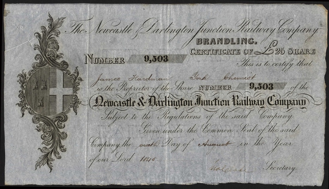 Newcastle & Darlington Junction Railway Co., £25 'Brandling' share, [1845], #9503, company seal in scrollwork at left, black. Opened in 1844 connecting the Great North of England and the Durham Junction Railways. The company purchased the aforementioned lines and the Brandling Junction Railway. It was amalgamated into the York, Newcastle and Berwick Railway which later formed part of the North Eastern Railway. Pin holes top left, otherwise GVF.