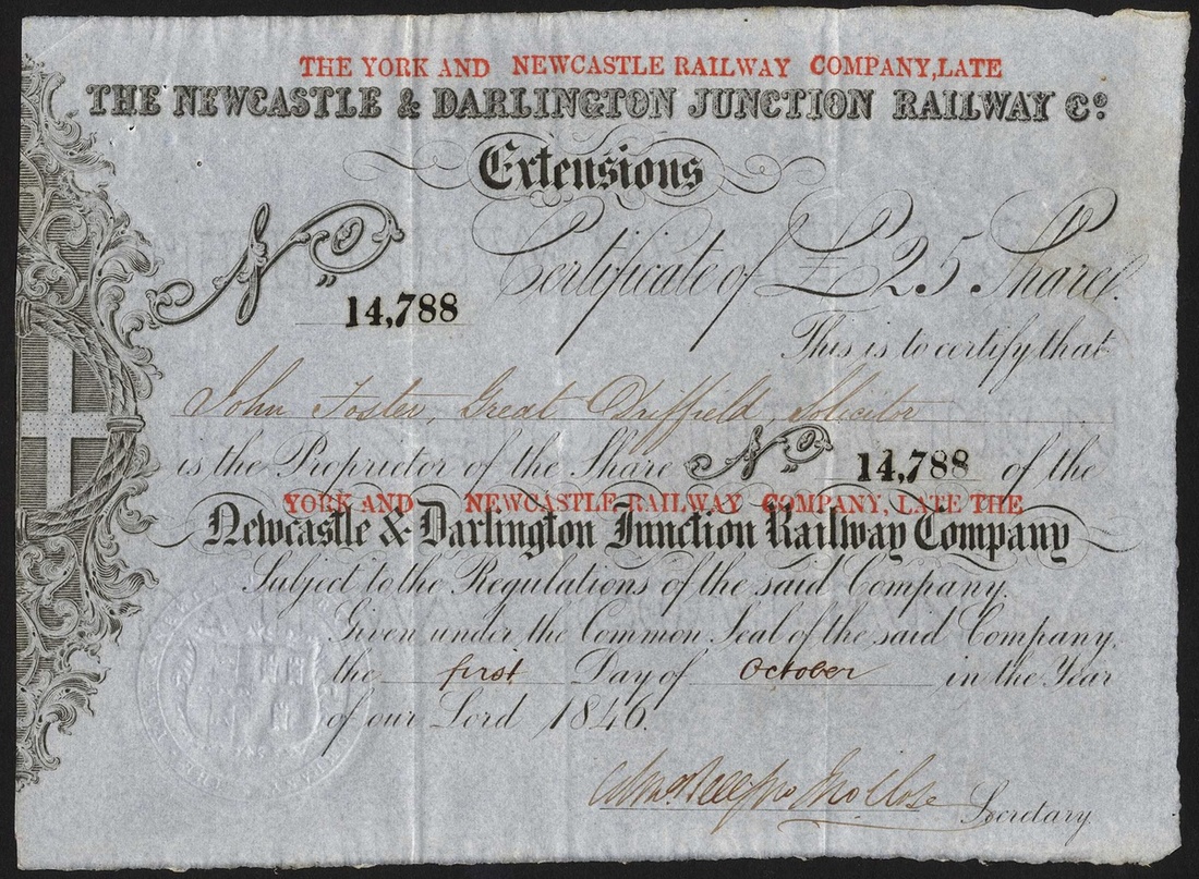 Newcastle & Darlington Junction Railway Co., overprinted York and Newcastle Railway Co., £25 'Extensions' share, 1846, #14788, seal in scrollwork at left, black. See previous lot. A few pinholes, GVF.