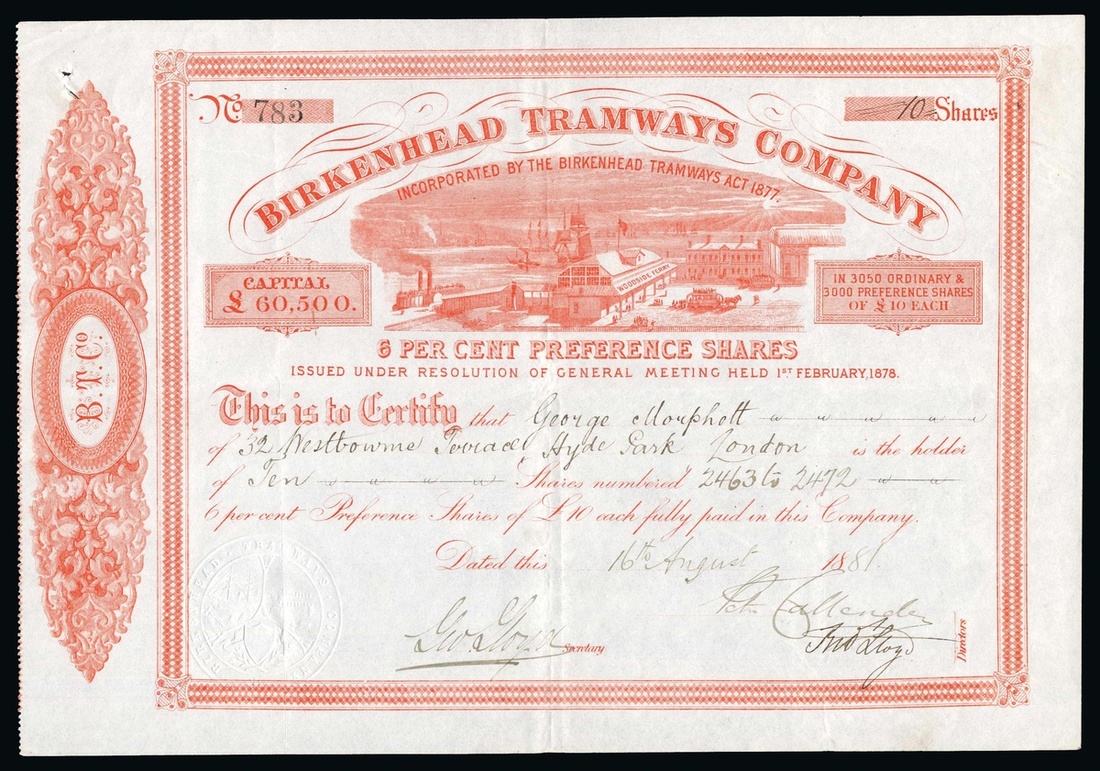 Birkenhead Tramways Company, 6% preference shares of £10, 18[81], #783, lovely vignette of the Woodside Ferry terminus with horse drawn tram waiting to depart, several ships at the dockside, red. Originally formed as Birkenhead Street Railway Co. Ltd. in 1860, the first tram line in the country. Under Act of 1877 acquired by this new company. In financial difficulty by 1889 and liquidated. By 1901 part of Birkenhead Corporation Transport. VF and scarce.