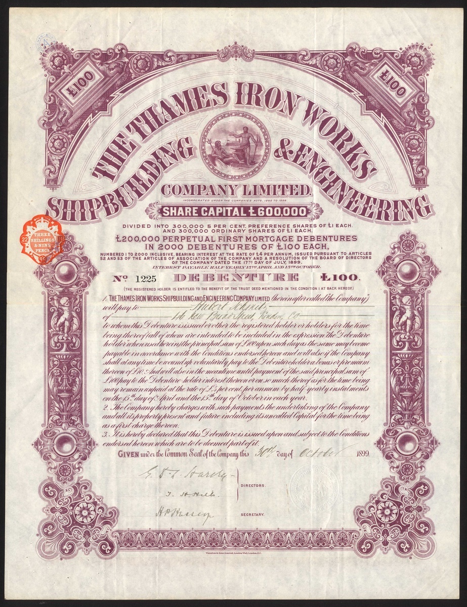 Thames Iron Works Shipbuilding & Engineering Co. Ltd., First Mortgage debenture for £100, 1899, #1225, large format piece with Gods at top, mauve, printed by Waterlow & Sons. The company's football team became professional in 1898 and re-named themselves West Ham United. GVF.