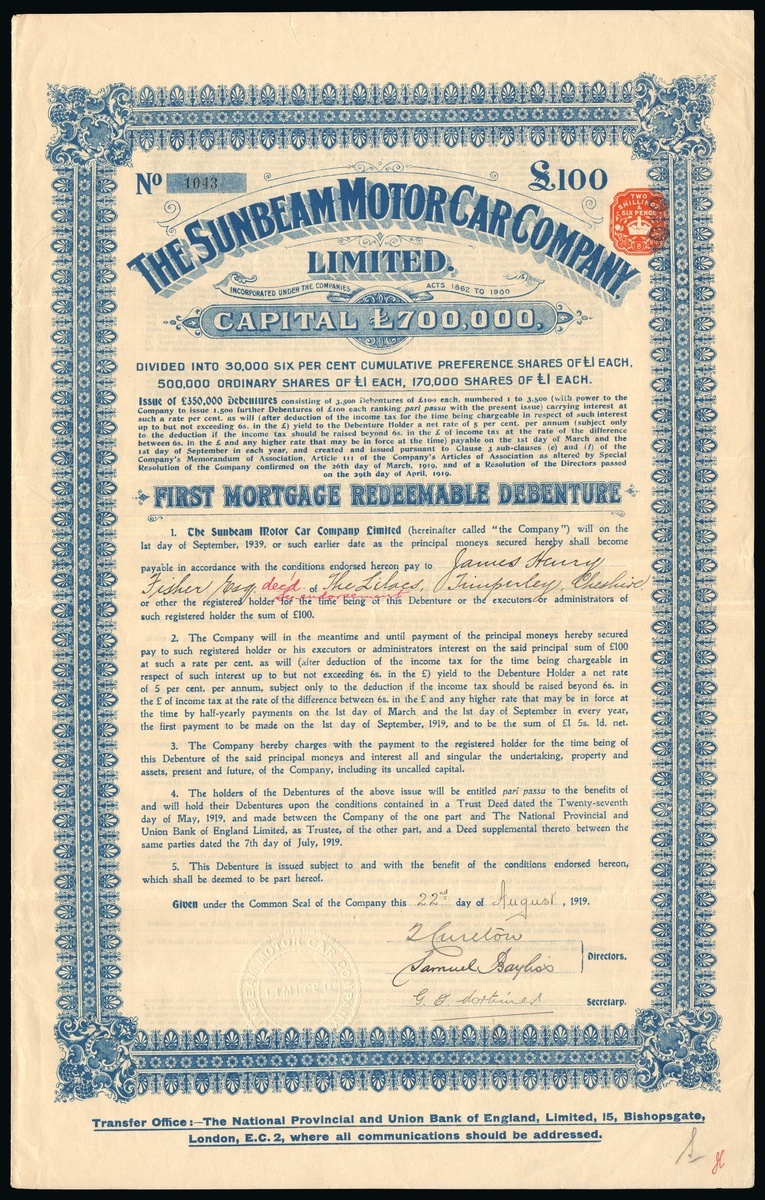 Sunbeam Motor Car Co. Ltd., First Mortgage redeemable debenture for £100, 1919, #1043, large format, blue. A British motor car manufacturer, who also produced aero engines. The company fell into financial difficulty and was bought by the Rootes Brothers who combined the company with their existing Talbot motor cars, naming them Sunbeam-Talbots, later dropping the Talbot from the name. Small tear at top, otherwise VF.