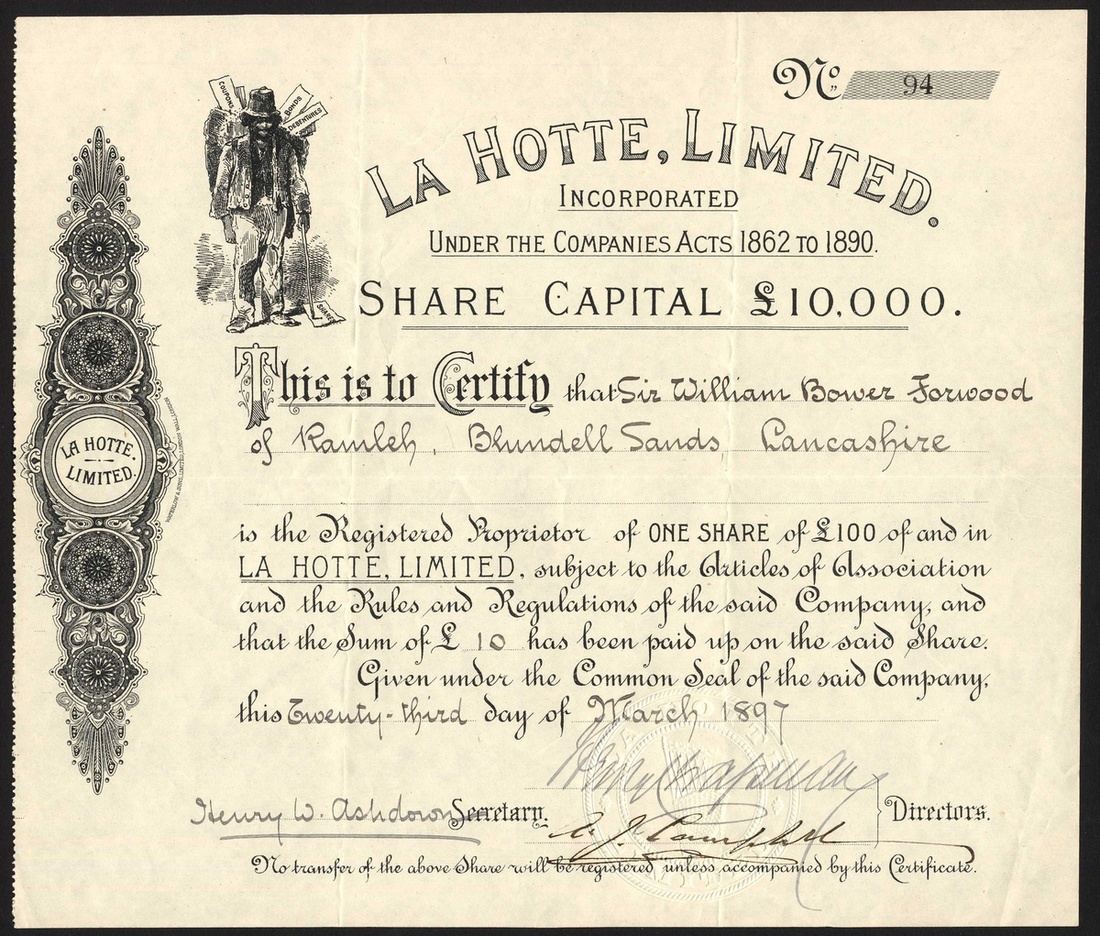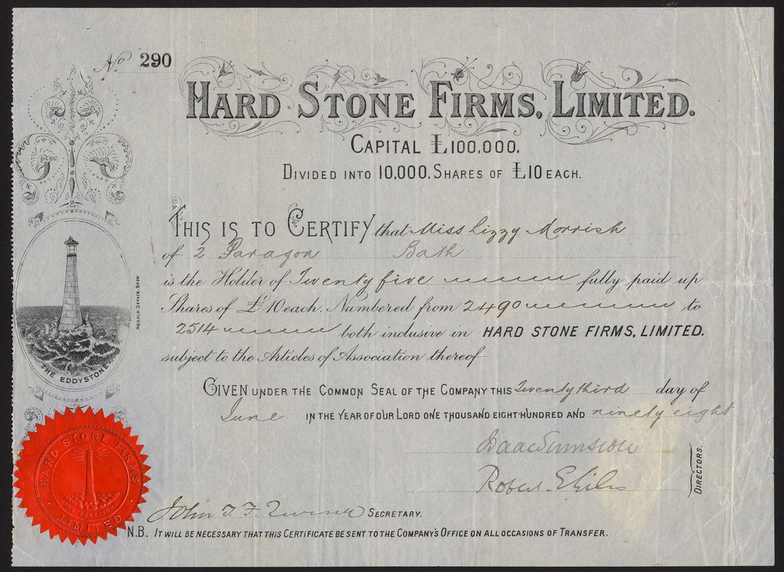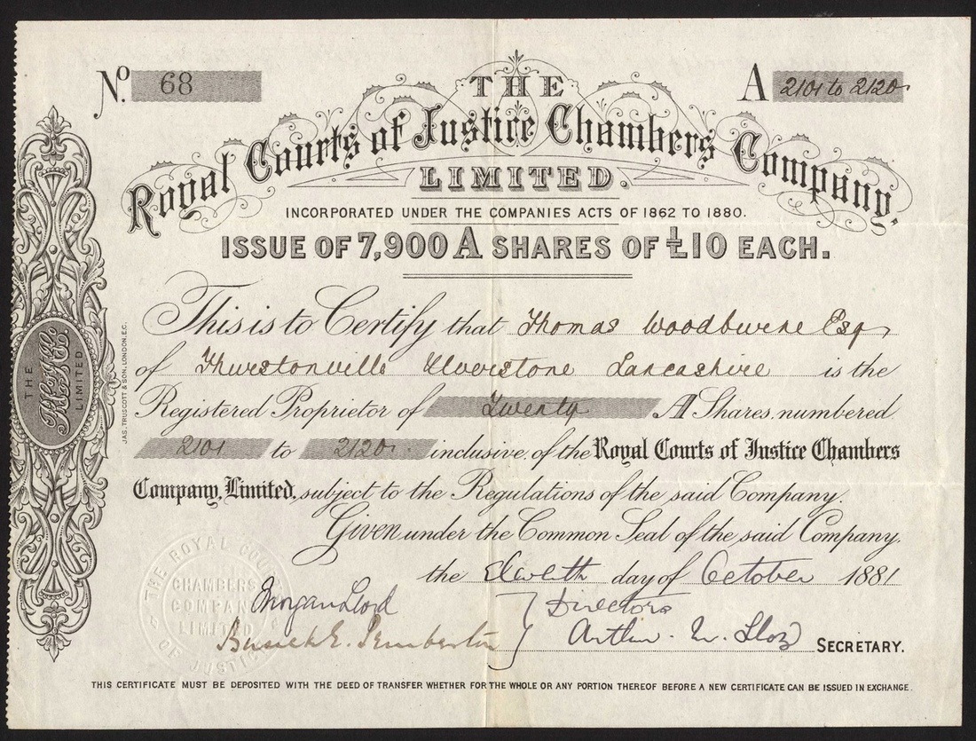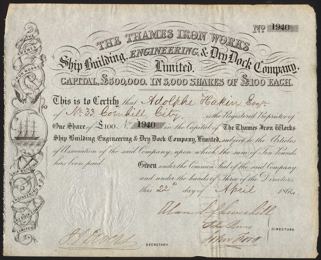 The Stock Exchange, £4 5s redeemable annuities, 19[66], #358, blue, cancelled; together with other English certificates including Colquitt Street Tontine, 180[7], on vellum; Thames Iron Works Ship Building, Engineering & Dry Dock Co. Ltd., £100 share, 186[4]; Hard Stone Firms Ltd., £10 shares, 18[98], vignette of Eddystone Lighthouse; La Hotte Ltd., £100 share, [1897]; Royal Courts of Justice Chambers Co. Ltd., 188[1]; Automatic Electric Railway Signal Co. Ltd., 18[88]; Eton Coffee Tavern Co. Ltd., 187[91]; Middleton & Tonge Cotton Mill Co. Ltd., 18[75]; Overend Gurney & Co. Ltd., 1865; London, Chatham & Dover Railway Co., 1864, and others (13). Many with vignettes, generaly VF or thereabouts. (24 items).