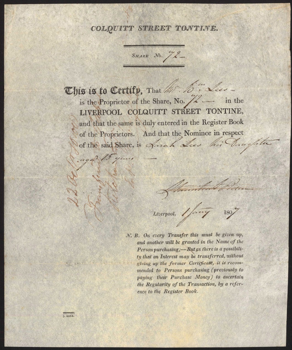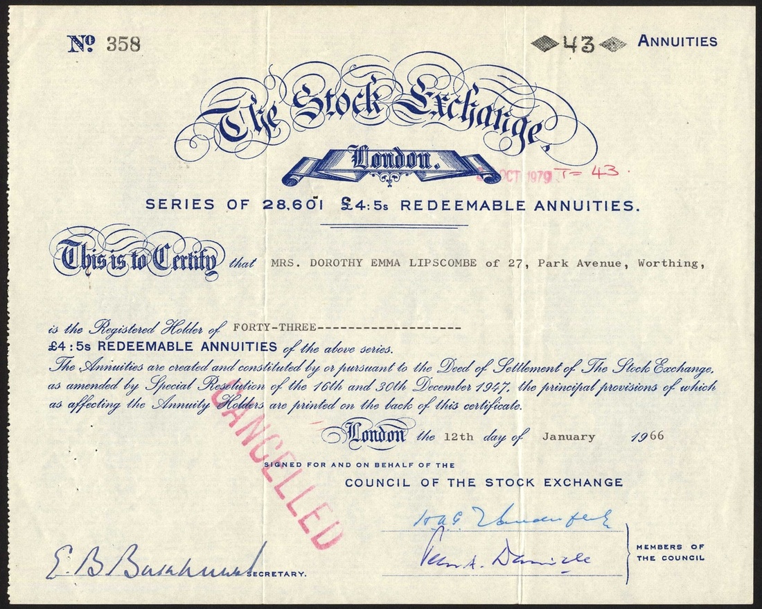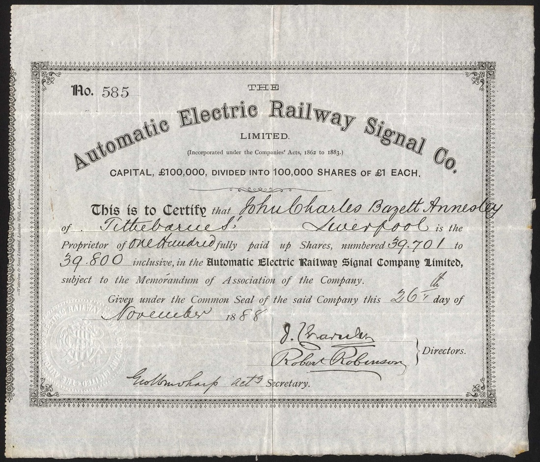 The Stock Exchange, £4 5s redeemable annuities, 19[66], #358, blue, cancelled; together with other English certificates including Colquitt Street Tontine, 180[7], on vellum; Thames Iron Works Ship Building, Engineering & Dry Dock Co. Ltd., £100 share, 186[4]; Hard Stone Firms Ltd., £10 shares, 18[98], vignette of Eddystone Lighthouse; La Hotte Ltd., £100 share, [1897]; Royal Courts of Justice Chambers Co. Ltd., 188[1]; Automatic Electric Railway Signal Co. Ltd., 18[88]; Eton Coffee Tavern Co. Ltd., 187[91]; Middleton & Tonge Cotton Mill Co. Ltd., 18[75]; Overend Gurney & Co. Ltd., 1865; London, Chatham & Dover Railway Co., 1864, and others (13). Many with vignettes, generaly VF or thereabouts. (24 items).