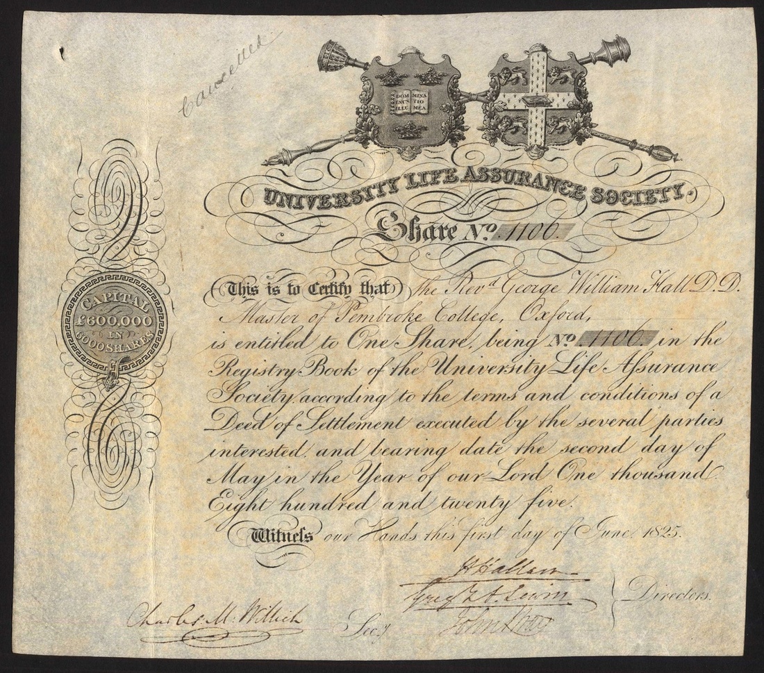 University Life Assurance Society, £100 share, 1825, #1105, attractive coats of arms of Oxford and Cambridge Universities at top, medallion and scrollwork left, black, on vellum, ink cancellation top left; together with other British companies comprising Bonnington Hotels Ltd, 4 different, 19[11], 19[30], 19[35] and 19[45]; Java & Borneo Co. Ltd., 19[10]; Honduras Trust Ltd., 192[1]; United Venezuelan Oilfields Ltd., 19[29]; Anglo East African Cotton Co. Ltd., £100 debenture, 1931 and Rand & East African Corporation Ltd., 19[34]. Generally VF and better (10).