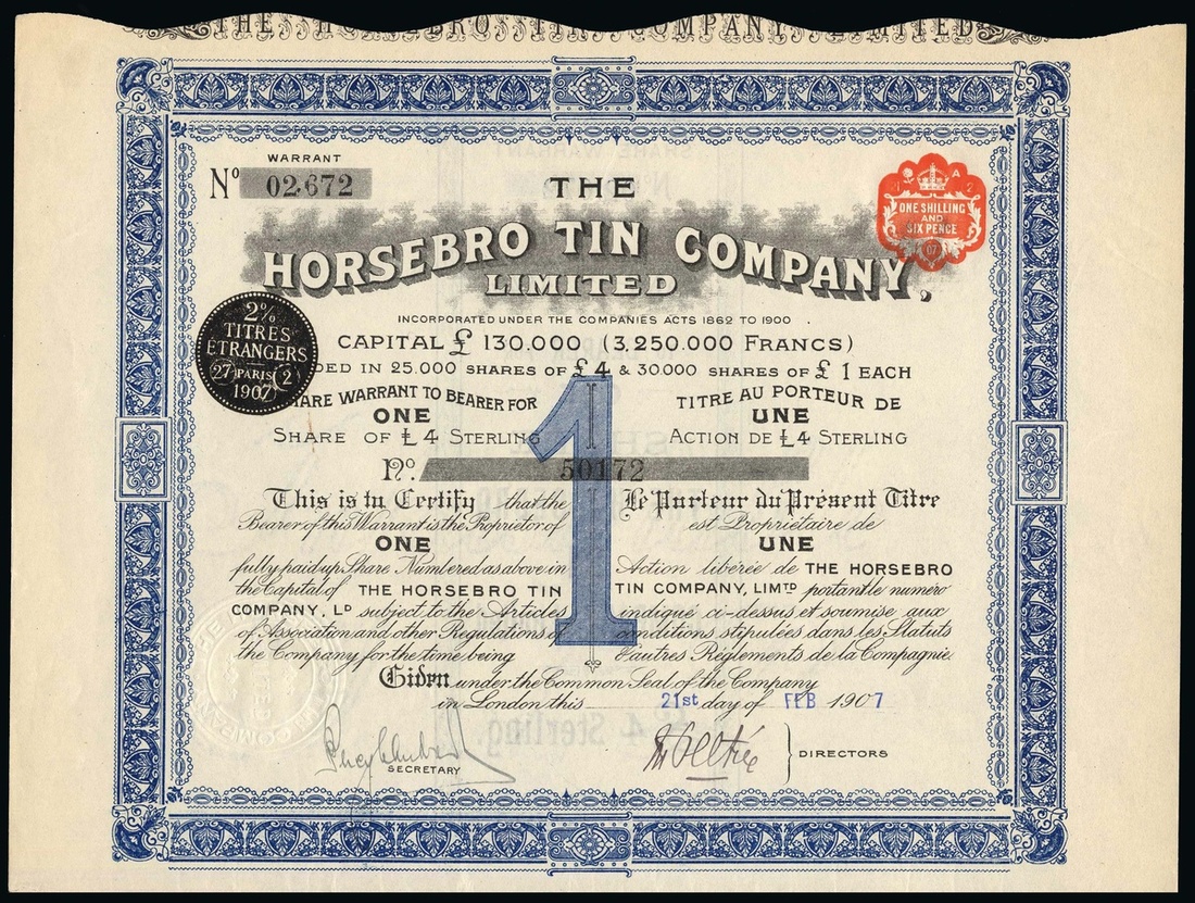 Horsebro Tin Company Ltd., a group of 13 bearer warants for 1 share of £4, London 190(7), ornate border, blue and black, text in English and French, with coupons. Formed to acquire several properties over 350 acres in the Parish of Altarnum, Cornwall. EF (13).