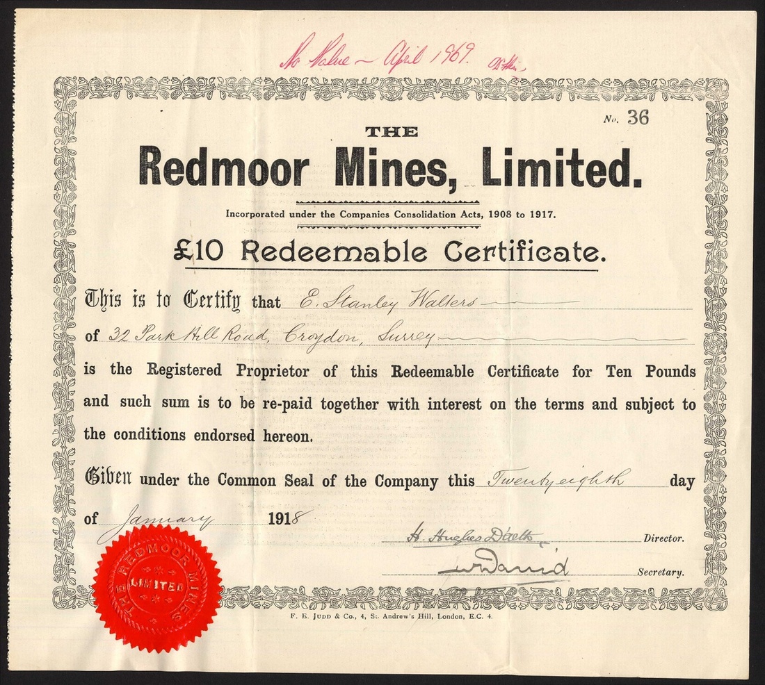 Redmoor Mines Ltd., a quantity of £10 Redeemable Certificates, 191[8], ornate border, black, red paper seal. One of a group of mines (Redmoor, Holmbush and Kelly Bray) based in South East Cornwall, extracting Tin and Copper. Although they were forced to close in the late 1890's due to low Tin prices, Redmoor Mine was re-opened in 1907, 1914 and 1934. The area is still being mined today. GVF (9).