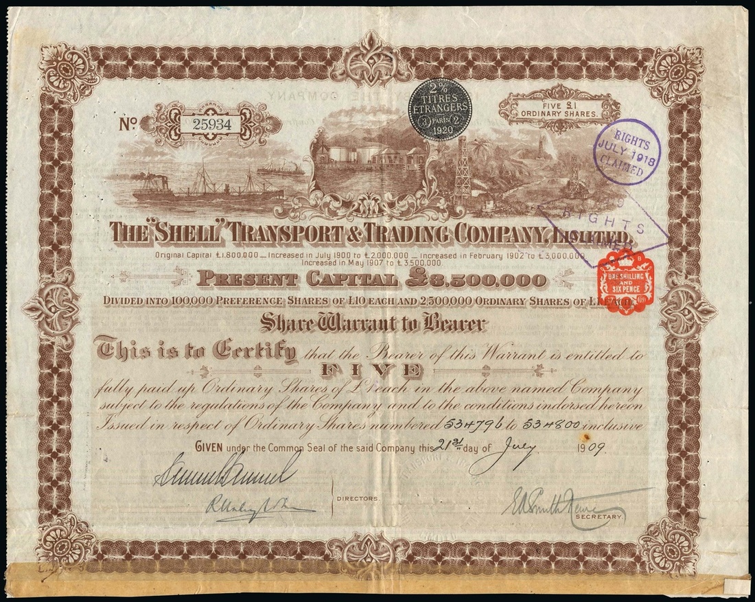 "Shell" Transport & TRading Co. Ltd., bearer warrant for 5 ordinary shares of £1, 19[09], no.25934, handsigned by Samuel Samuel as director, vignettes of oil wells, oil tanker and oil tanks, brown with pale blue underprint, capital £3.5 million, with coupons, AVF and a scarce early date.