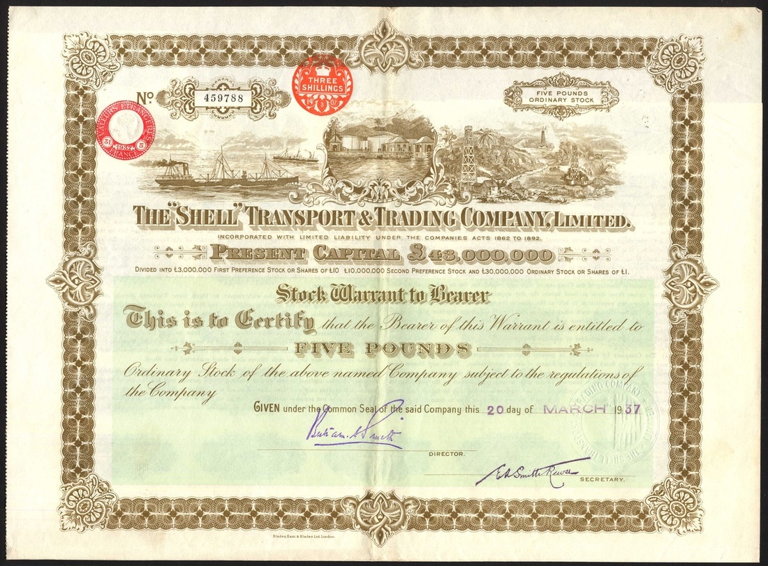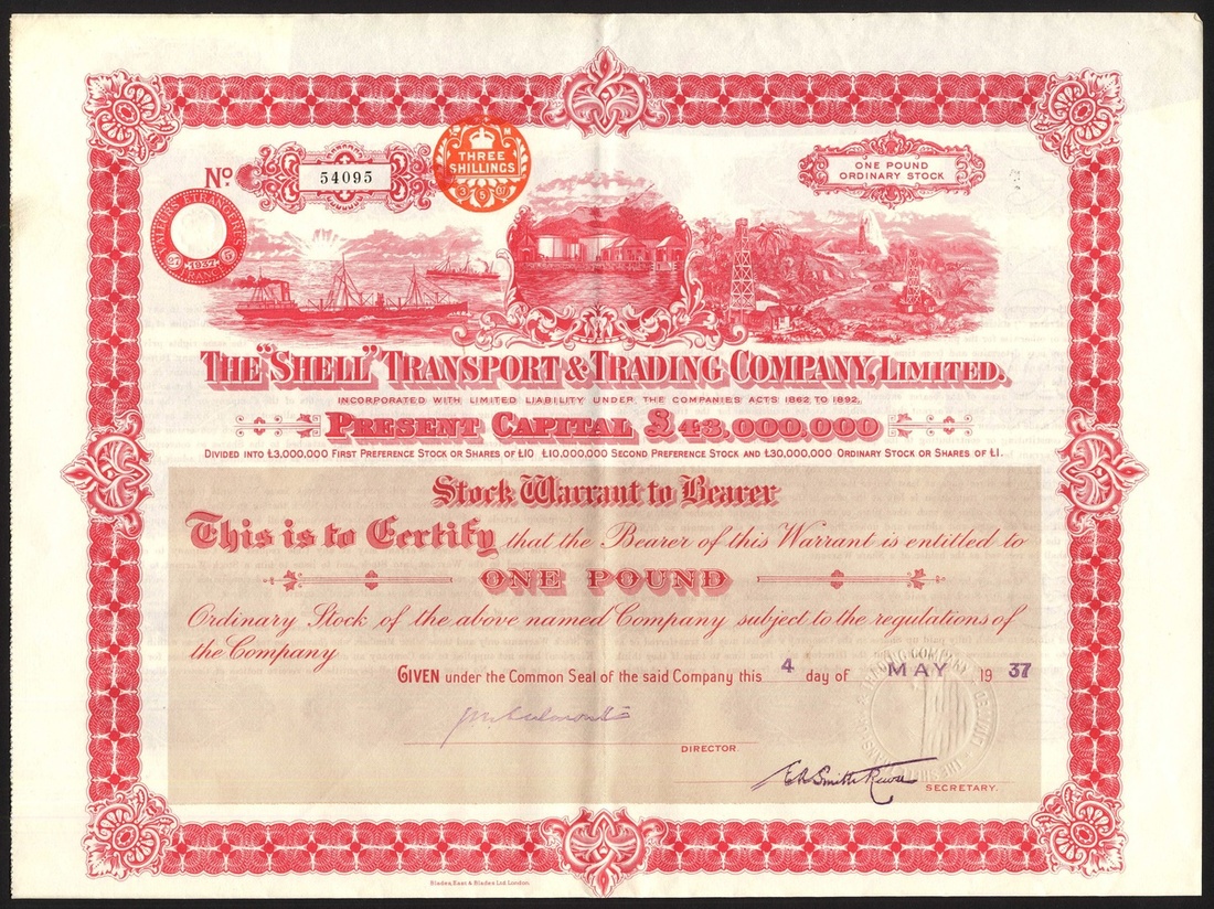 "Shell" Transport & Trading Co. Ltd., pair of bearer warrants for £1 and £5 ordinary stock, 19[37], no's.54095 and 459788, vignettes of oil wells, oil tanker and oil tanks, red and brown with pale blue underprint, capital £43 million, with coupons, VF (2).