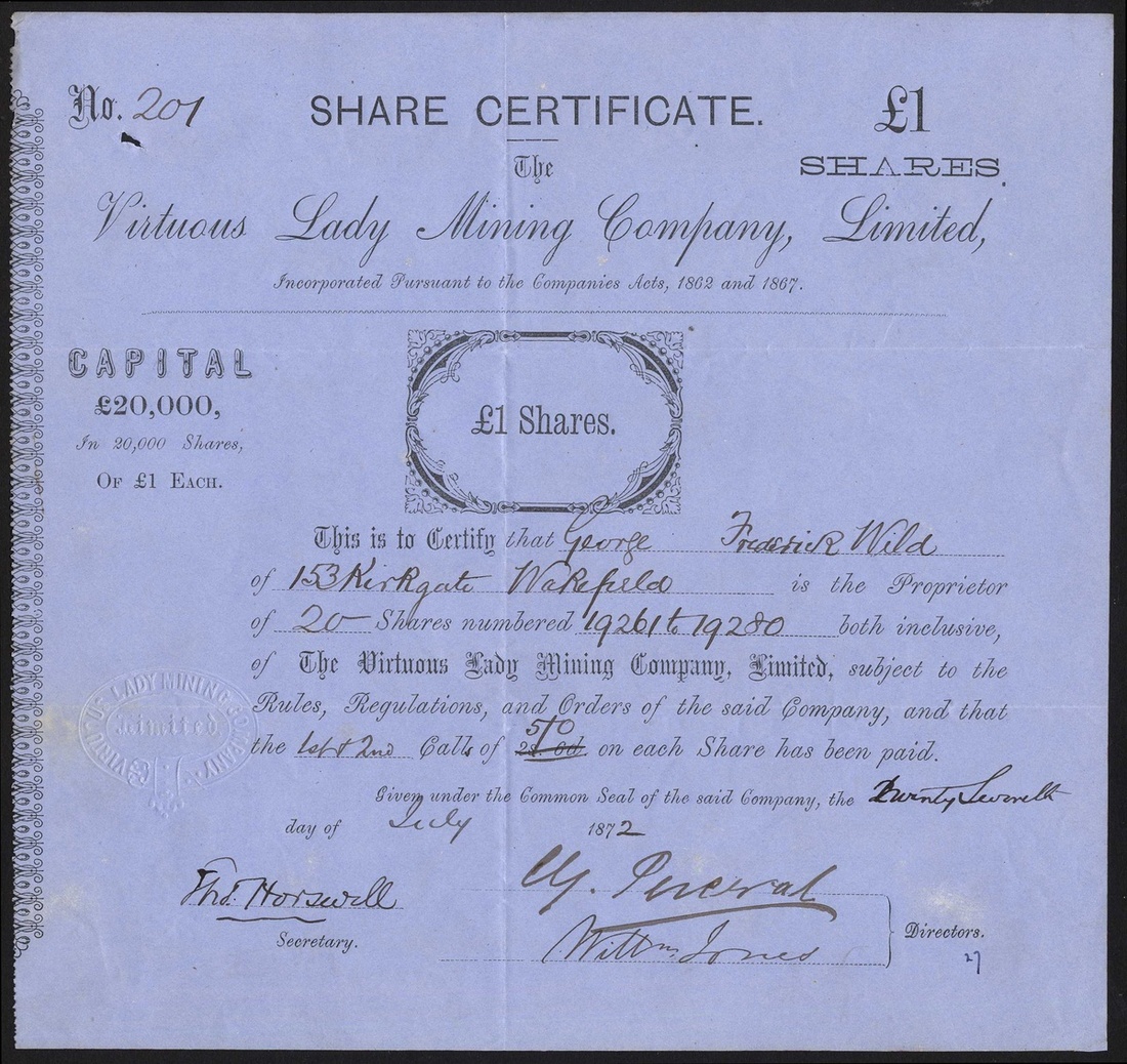 Virtuous Lady Mining Co. Ltd., Tavistock, Devon, £1 shares, 187[2], black on blue paper; togerther with other UK and overseas mining, oil and quarrying companies (21), including United States Gold Placers Ltd., 1888; United States Gold Placers (New Company) Ltd., 1889; Ray Copper Mines Ltd., 1899; United Stone Firms Ltd., 1912; Worth Quarries Ltd., 1929; Commonwealth Oil Corporation Ltd., £100 debenture, 1909; Petroleum Oil Trust Ltd., 1894 and 1902, and, Maikop and General Petroleum Trust Ltd., 1910. Mixed condition, F-VF (22)