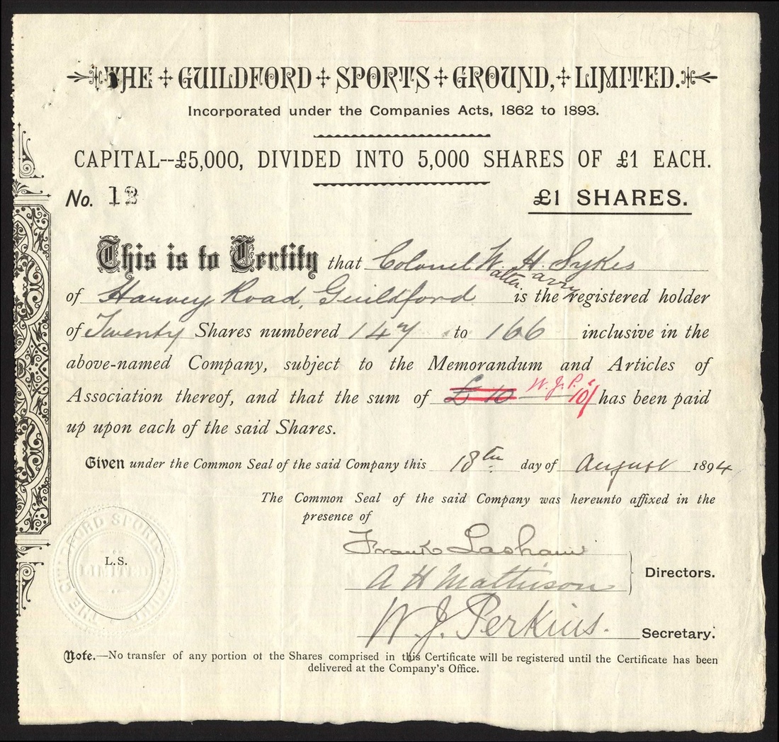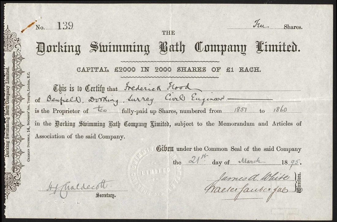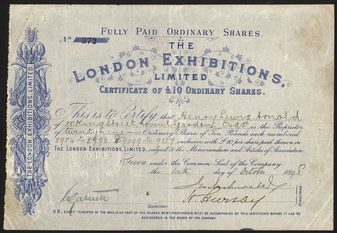 London Exhibitions Ltd., £10 ordinary shares, 18[98], #372, scrollwork left, blue. Company created by impresario Imre Kiralfy in 1894 to acquire the Earl's Court Exhibition Grounds. He redeveloped the site for the Empire of India Exhibition in 1895 which was followed by new exhibitions for the next 8 years when Kiralfy resigned from the board. Earl's Court was sold and redeveloped in its present Art Deco style in 1935, opening again in 1937. F-VF and scarce. Together with other entertainment related companies comprising Strand Music Hall Co. Ltd., £10 share, 1862, black. Acquired the Lyceum Theatre in the Strand. Sold in 1868 to become the Gaiety Tgeatre, demolished in 1956. Guildford Sports Ground Ltd., £1 shares, 189[4], and, Dorking Swimming Bath Co. Ltd., £1 shares, 18[95]. These VF (4).