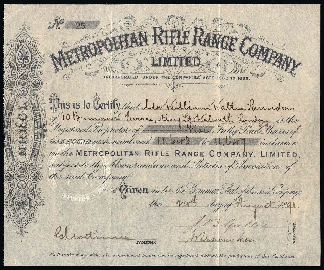Metropolitan Rifle Range Company Ltd., £1 shares, fully paid, 18[91], #25, black, with various related documents including a coloured plan of the range. Firing Range for both regular and volunteer troops at Staines, Middlesex. Apparently firing had to cease just during haymaking but ceased altogether a few years later as it was considered a danger to railway travellers. Both the London & South Western and Great Western Railways lines ran adjacent to the property. VF (lot).